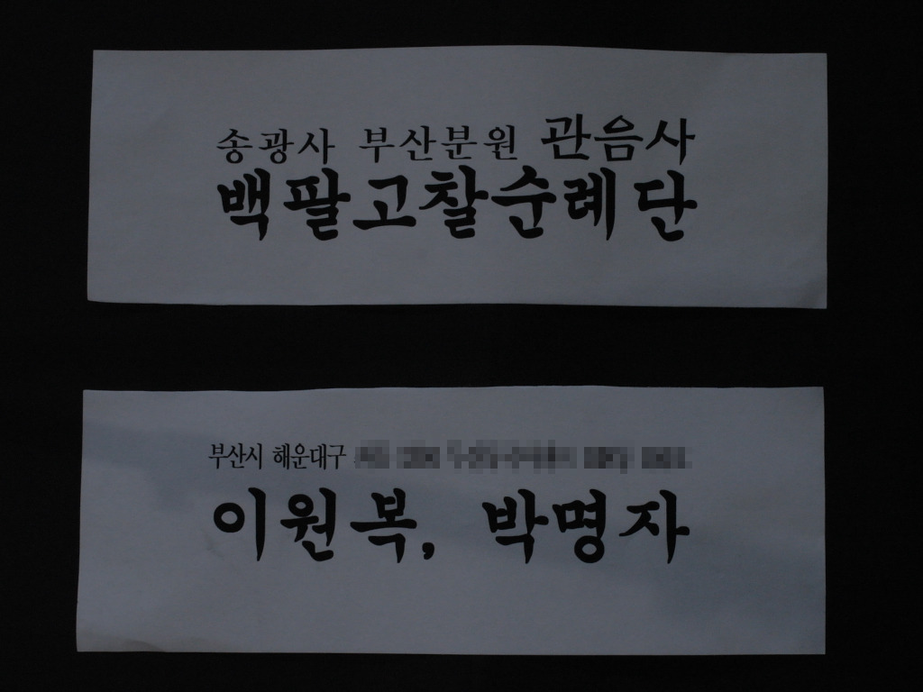 7월 13일 ‘백팔고찰순례단’의 오대산 중대 사자암 적멸보궁, 상원사, 월정사 순례에는 동아대학교 교수불자회 회장과 학생처장, 대학원장을 엮임한 오교수님 일행 세분과 일찌기 영남범패와 경기범패를 전수받아 통도사 포교사들에게 범패와 불교의식을 지도(나도 여기서 지금 범패와 불교의식을 배우는 중임)하는 통도사 포교사회 사무국장인 석암님과 세분의 예비포교사가 동참하고, 이번에도 인근 괴정동 거주 통도사 사찰 안내팀인 ‘적멸도량회’ 소속 지혜심보살님과 도반들 10여분의 동참으로 총42명이 동참하기로 하였는데, 3일전에 건강상 이유로 2분, 당일 한분이 집안사정으로 못오게되어 39명이 순례에 동참하게 되었습니다. 위 표지는 공양물에 부착한 표지로 관음사 고찰순례단 명의를 부착한 공양물은 부처님 왼쪽에, 아래 이원복씨 이름의 표지는 부처님 오른쪽에 올린 공양물에 부착하였습니다. 이번에 이원복 거사님이 20만원을 보시하여 적멸보궁과 사자암 비로전, 상원사 문수전, 월정사 적광전에 공양물(떡)을 올렸습니다. 이원복님, 이 인연공덕으로 업장이 소멸되고 불보살님 가피가 항상 함께하길 기원합니다.