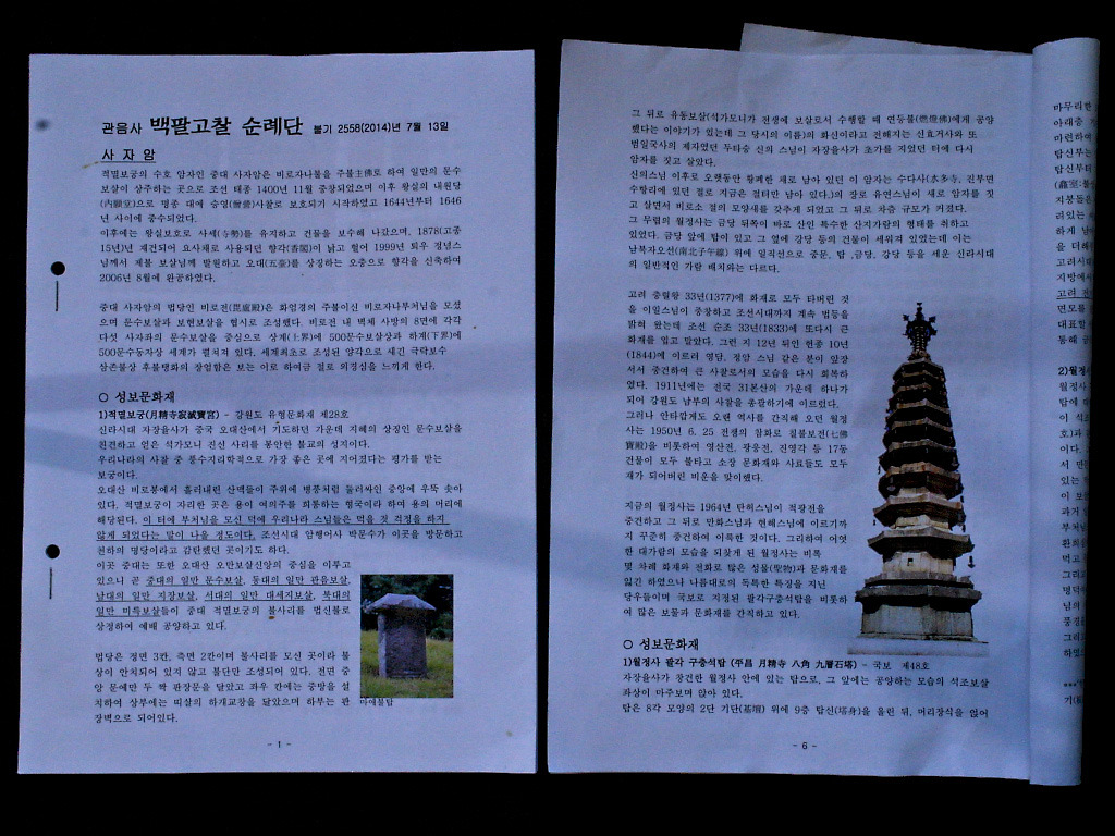 출발시간 20분전에 불교TV에서 발매한 새벽예불 DVD가 돌아가면 버스는 도량송과 종송, 타고명종이 울리는 도량이 됩니다. 출발 5분후면 오분향례가 진행되고 이어서 칠정례가 시작되면 전문포교사인 수행심 보살님의 목탁과 DVD에 따라 예불을 올리고, 이산혜연선사 발원문, 반야심경, 천수경 봉송으로 차내 의식이 진행되었습니다. '아는만큼 보인다'는 명제에 따라 순례사찰에 대한 사전지식 습득을 위해 8페이지 분량의 사찰안내 인쇄물(아래 사진)을 배부하였으며, 버스내 새벽예불후 (1)부처님 오신날 특집 ‘부처님 나라 오대성산’(45분) (2)한국의 명찰 ‘오대산 월정사’(52분) (3)내가 가고 싶은 절 제19회 ‘문수성지 오대산 상원사’(24분) DVD를 불교TV에서 구입하여 버스내에서 방영하였습니다. 이번 사찰안내는 포교사단 강원지역단 사찰문화해설 총괄1팀에서 안내와 해설을 하여주었습니다. 최자규 강원지역단 사찰문화해설팀장님, 유익한 해설을 해주신 정진순 포교사님과 팀원들에게 감사드립니다.