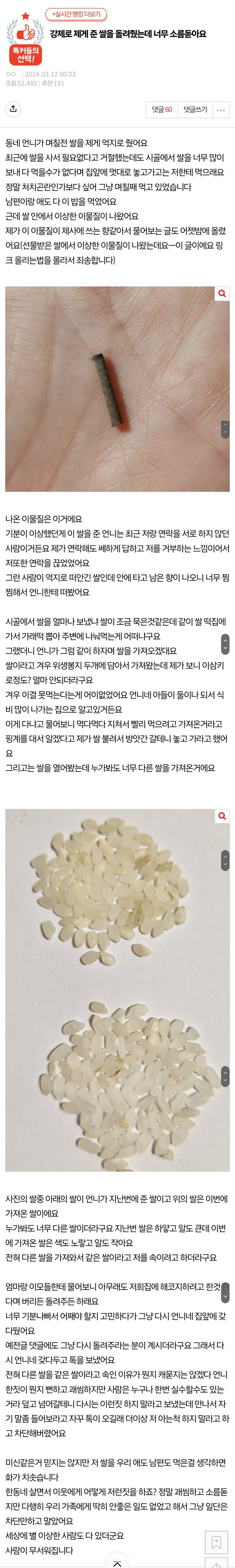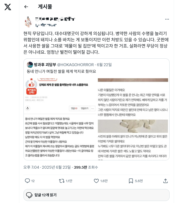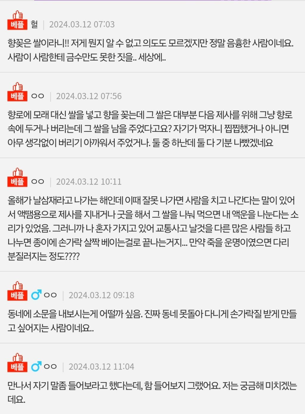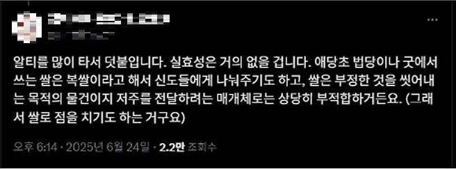 - 요약 : 대수대명굿에 쓴 쌀을 다른 사람에게 먹임으로써 나의 재액을 다른 사람에게 떠넘기려는 시도일 수도 있겠으나..... 쌀은 대수대명의 매개체로 썩 좋은 매개체는 아님. 그래서 실효성은 적을 것임