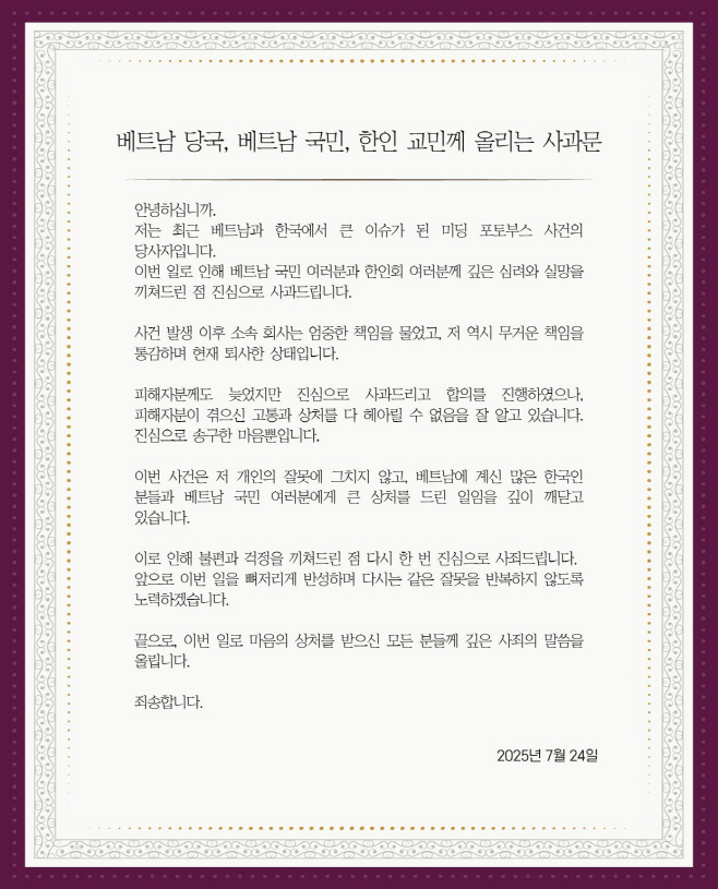 그리고 바로 어제, 가해자는 베트남 당국과 베트남 국민, 그리고 베트남에 있는 한국 교민들을 상대로 사과물을 올렸습니다.
