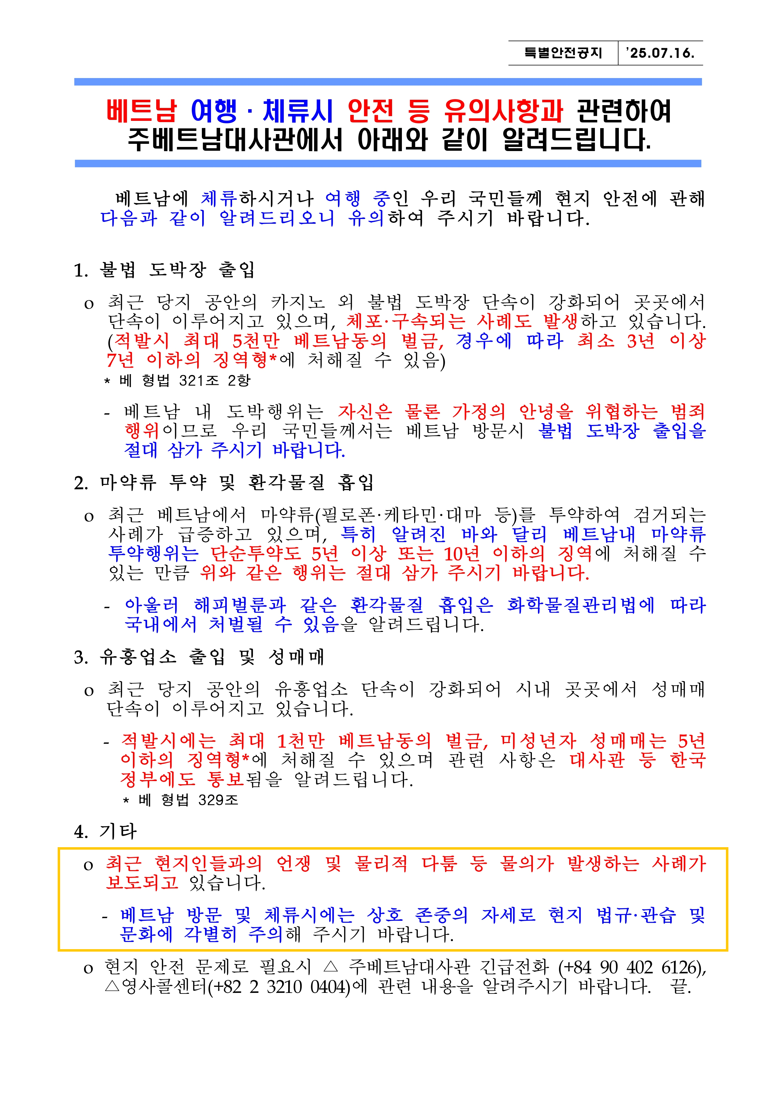 그래서 주베트남 한국대사관 측에서는 이 사건으로 인해 베트남에서 반한국 감정이 커지지 않을까 우려하는 상황입니다. 그래서 며칠 뒤에 주베트남 한국대사관 홈페이지에 공지된 <베트남 여행 시의 특별안전공지> 안에 이 사건 관련 내용도 포함되었습니다.