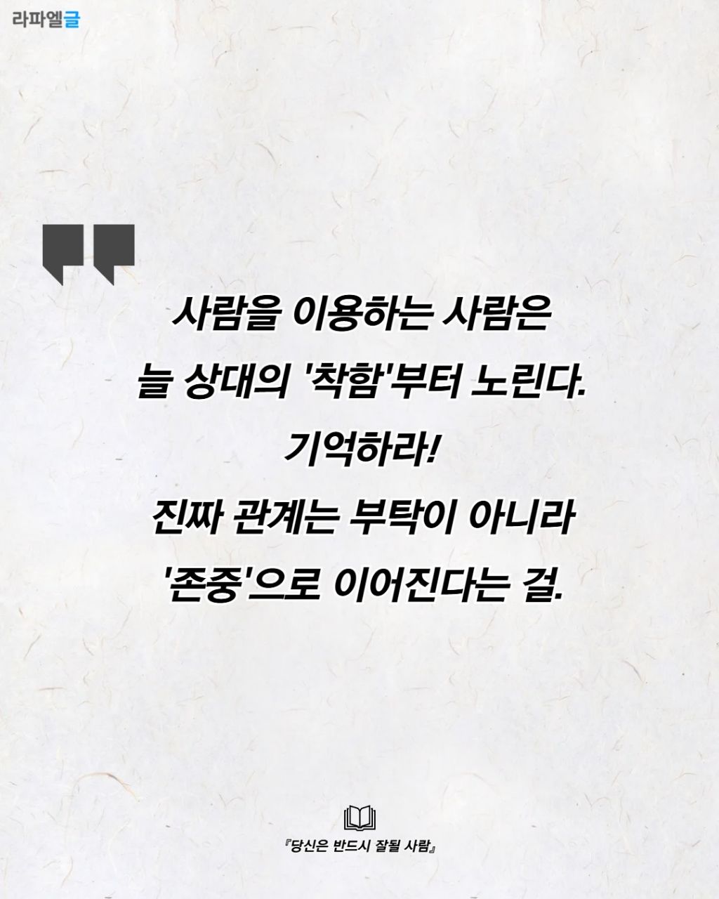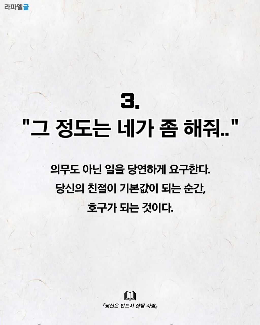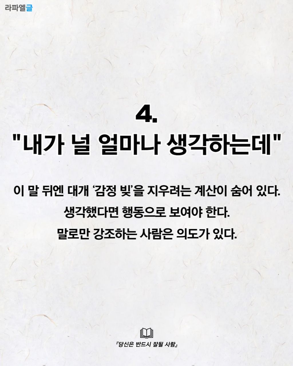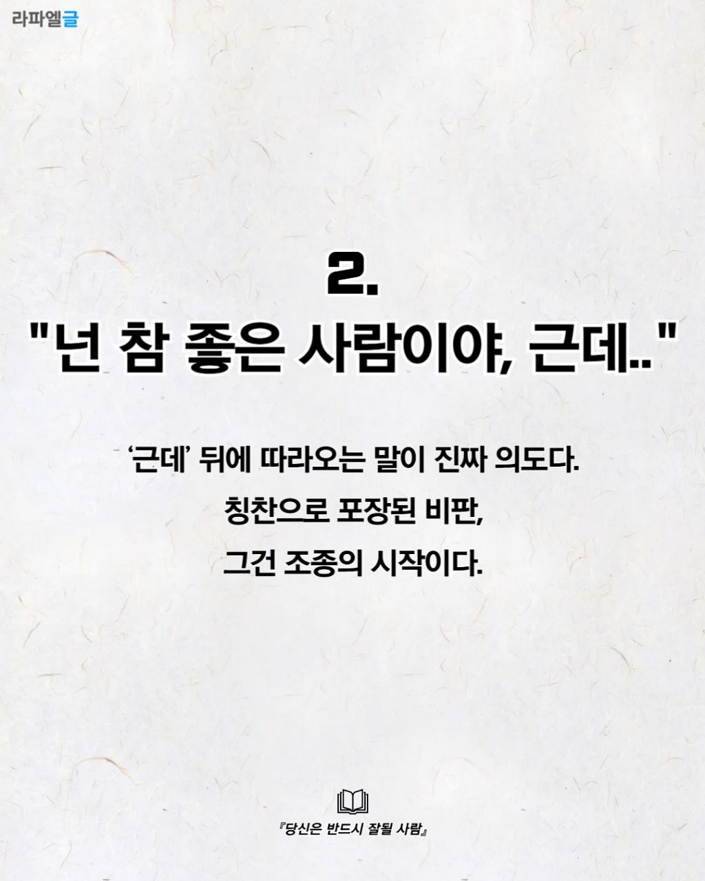 [ 삶의 지혜 ] 상대를 '호구로 볼 때' 작성자한강자전거|작성시간26.01.07|조회수2,074 목록 댓글 4 글자크기 작게가 글자크기 크게가 다음검색 현재 게시글 추가 기능 열기 북마크 공유하기 신고 센터로 신고 댓글 댓글 4 댓글쓰기 답글쓰기 댓글 리스트 작성자랄라라에요 | 작성시간 26.01.07 가스라이팅 이네요.. 작성자새로운시작1234 | 작성시간 26.01.08 맞네요 전형적인 가스라이팅 어투 작성자그냥22 | 작성시간 26.01.08 며칠전에 40년 지기한테딱 저 소리들을 들었고손절했어요 작성자익명질문 | 작성시간 26.01.08 저 말이 전체를 왜곡하면 곤란합니다. 댓글 전체보기