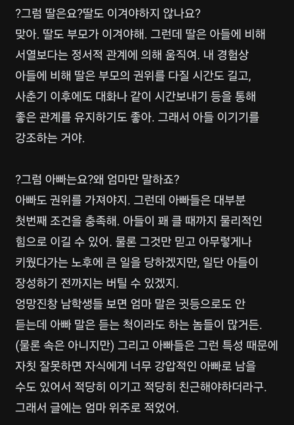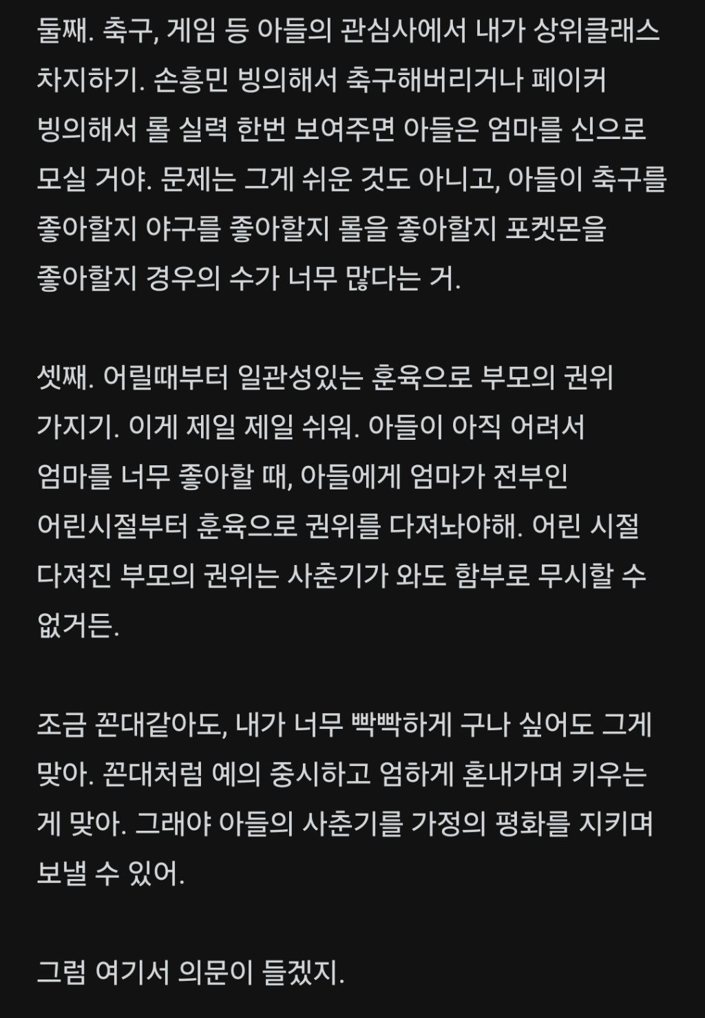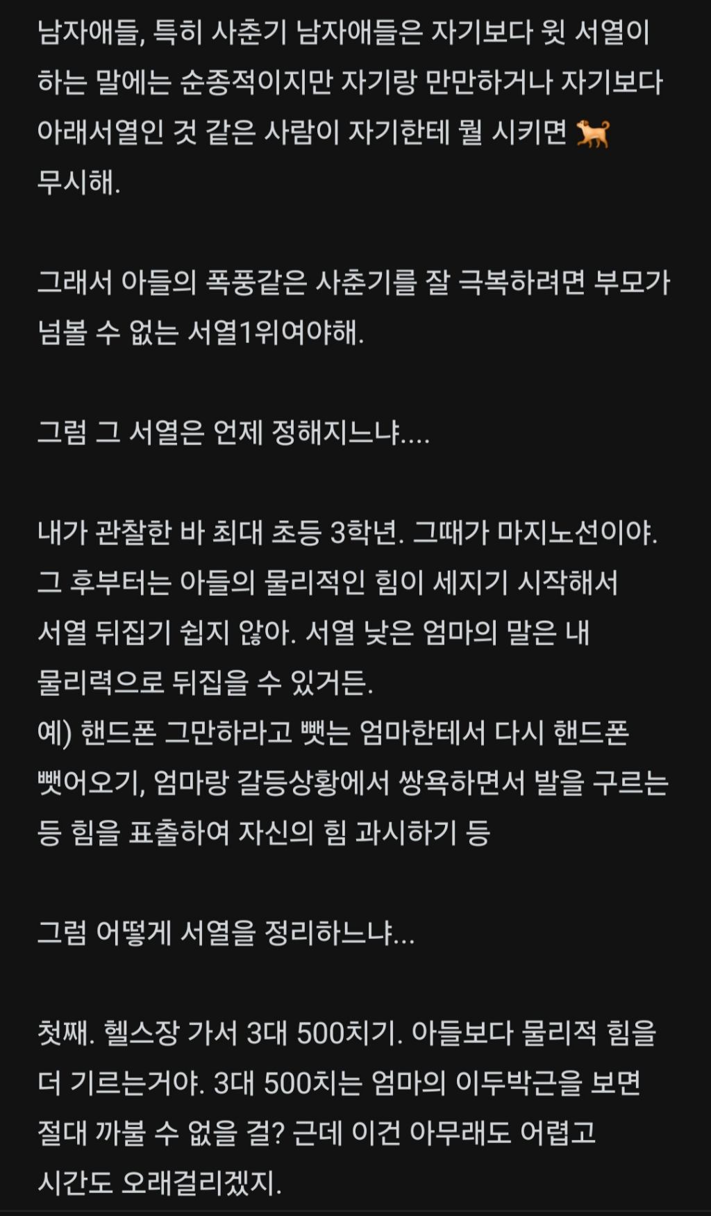 작성자타코가좋아요 작성시간 26.03.22 저도 원글에 동의하는 엄마에요. 어려도 남자라고 서열을 중요시하더라고요. 아들의 우위를 점하려고 애와 대립시엔 회피하지 않았어요. 그리고 삼춘기 즈음? 애가 기싸움 걸길래 애 사교육을 싹 끊어버린 때가 있어요. 속으로 놀란 듯 하더라고요. 엄마가 말로만이 아니라 진짜 하는구나. 다행히 애는 학원도 좋아하고 공부를 잘하고 싶어하는 애라서 다시 그런 일이 있을까 조심해요. 그리고 한번 허용하지 않는 것은 반드시. 절대 불가 라고 못 박아요… 요즘은 사춘기가 전보다는 약간 잦아든 느낌이에요. 제발 사춘기 빨리 끝나고 일띡 철들면 좋겠어요