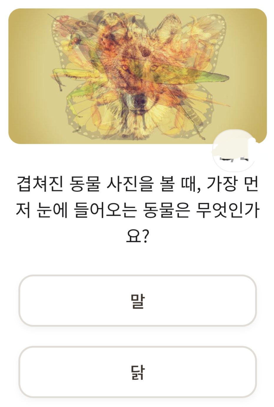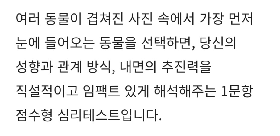 가장 먼저 보인 동물로 아는 정확한 성향 작성자잌명|작성시간26.04.14|조회수468 목록 댓글 202 글자크기 작게가 글자크기 크게가 1.말2.닭3.꽃게4.사마귀5.늑대6.강아지7.독수리8.나비9.비둘기 다음검색 현재 게시글 추가 기능 열기 북마크 공유하기 신고 센터로 신고 댓글 댓글 202 댓글쓰기 답글쓰기 댓글 리스트 작성자강남제시 | 작성시간 26.04.20 4 해당 댓글은 작성자와 운영진만 볼 수 있습니다. 작성자메주짱 | 작성시간 26.04.21 new 4, 5 해당 댓글은 작성자와 운영진만 볼 수 있습니다. 해당 댓글은 작성자와 운영진만 볼 수 있습니다. 댓글 전체보기