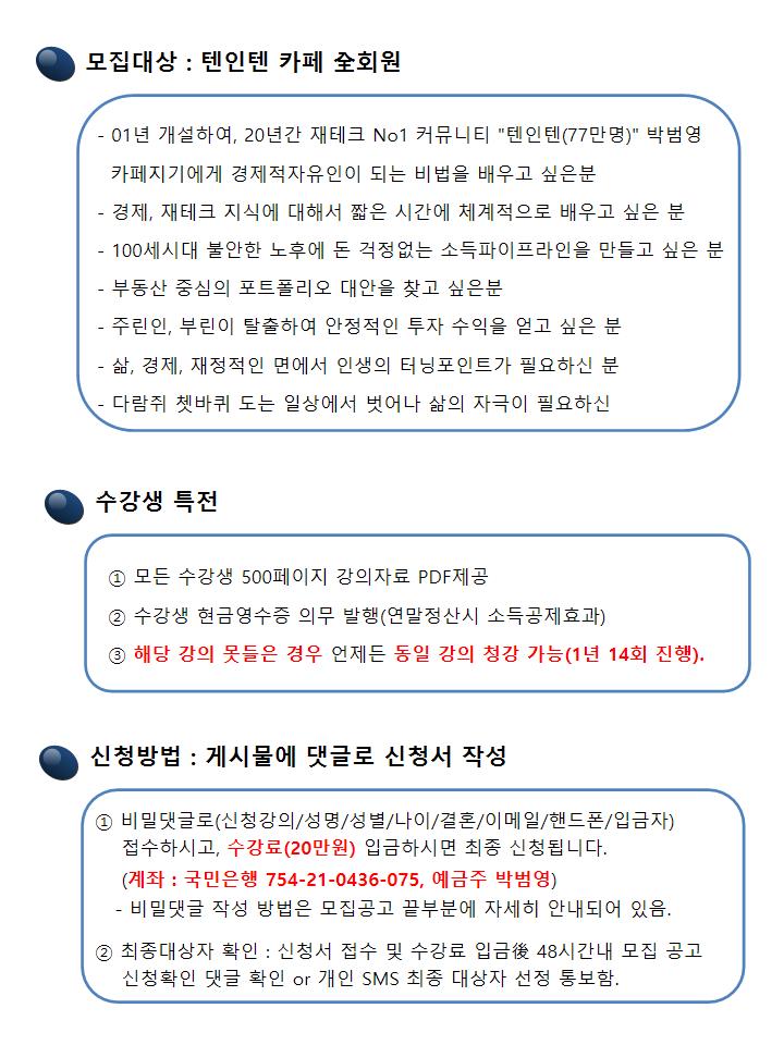 - 보통 경매, 주식 등 재테크 강의는 시간당 3~4만원이상 책정되고 있습니다. - 경제적자유인 아카데미는 18시간, 20만원이고, 시간당 1만원 수준에서 강의료 책정됐습니다. 100% 현금영수증, 매주 뒷풀이 진행, 희망자 무료상담 등 다양한 많은 혜택을 제공하고 있습니다. - 텐인텐 카페주인장이자, 경제적자유인으로 13년간 살아오고 있는 카페지기가, 경제적 자유인이 되고자 하는 많은 분들에게 지식 나눔차원에서 13년간 진행해온 강의입니다. |