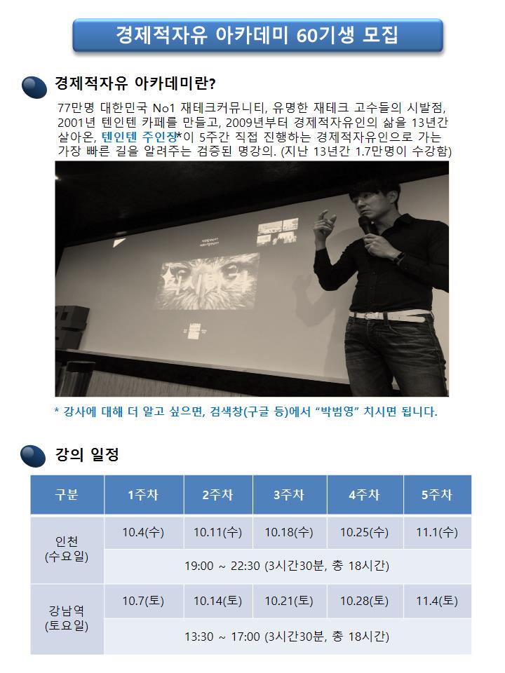 [[공지사항]]경제적자유아카데미 60기 모집안내(강남 토요반 10.7~11.4, 인천 수요반 10.4~11.1)