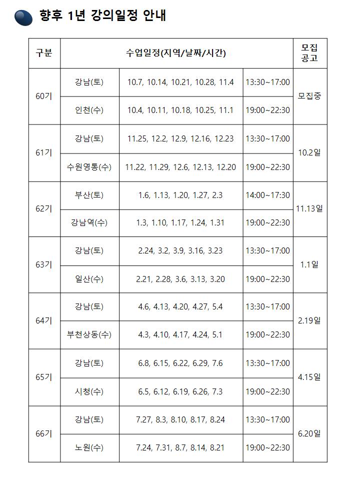 - 한번 등록한 분들중에서 해당기수에 못들은 수업은, 언제든 그 수업에 대해서 청강이 가능합니다. 5주간 강의 모듈은 동일하기 때문에, 3, 5주차 수업을 해당기수 못들었으면, 공지된 1년 강의일정을 보시고, 청강하고 싶은 날짜에 강의기수 모집공고에 댓글 적으시고, 오시면 됩니다. |