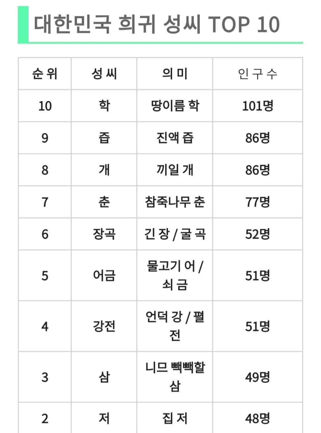 우리나라 희귀성씨 순위 TOP10 작성자노마드인생|작성시간23.12.16|조회수1,520 목록 댓글 2 글자크기 작게가 글자크기 크게가 신기한 성씨가 많아요 ~ ㅎ출처(1위보기) : https://cer.albongstyle.co.kr/46 다음검색 현재 게시글 추가 기능 열기 북마크 공유하기 신고 센터로 신고 댓글 댓글 2 댓글쓰기 답글쓰기 댓글 리스트 작성자ㅍㅎㅎㅎㅎ | 작성시간 23.12.16 저요, 저나라, 저금, 저기요...삼다도,삼다수,삼라(실제 봤음) 작성자뽁실이 | 작성시간 23.12.16 아마 일본아니면 중국 에서 한국 귀화 성씨일거에요 댓글 전체보기