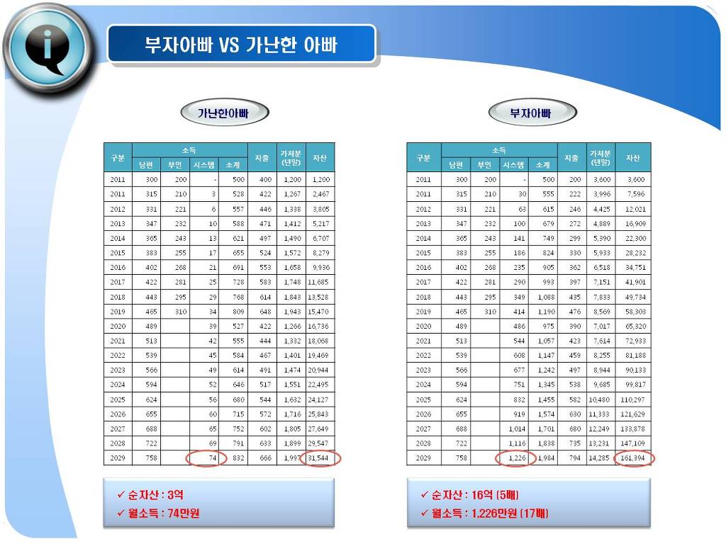 - 마지막에는 그런 결실로 과거 출발시점과 8년이 지난 현시점의 자산현황, 그리고 10년뒤이 자산내용에 대한 설명을 하고,