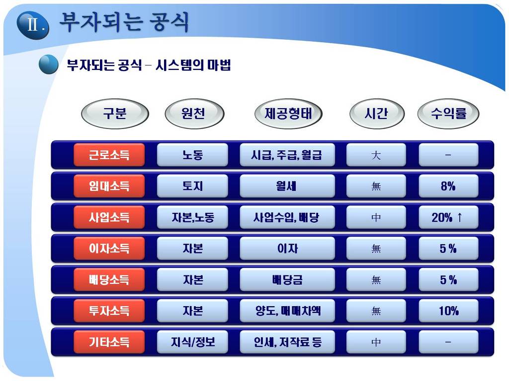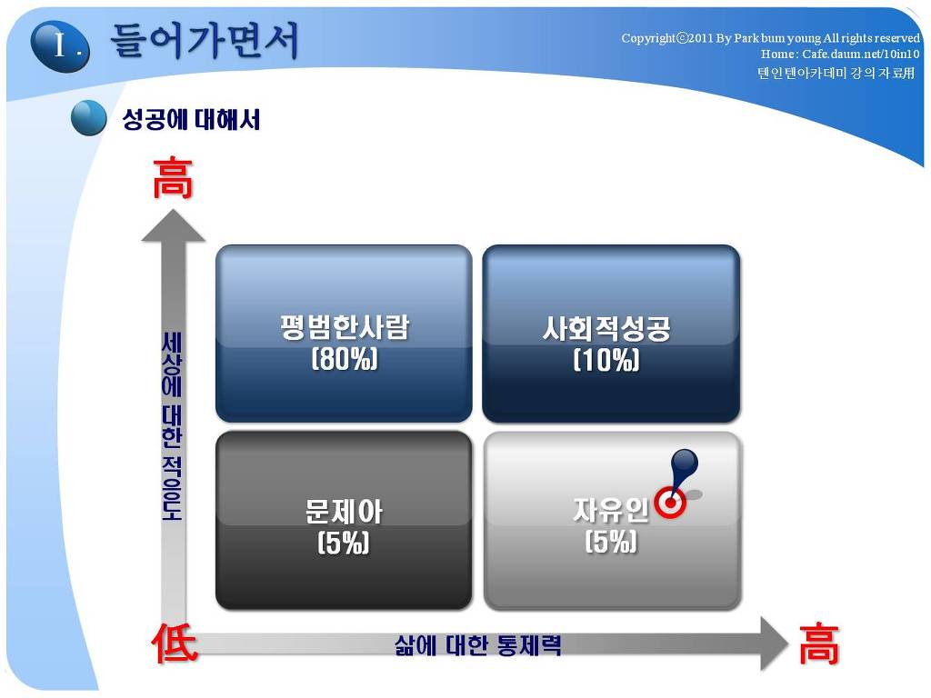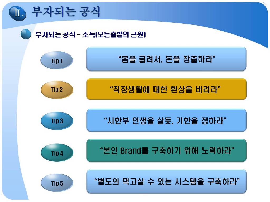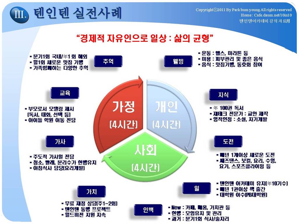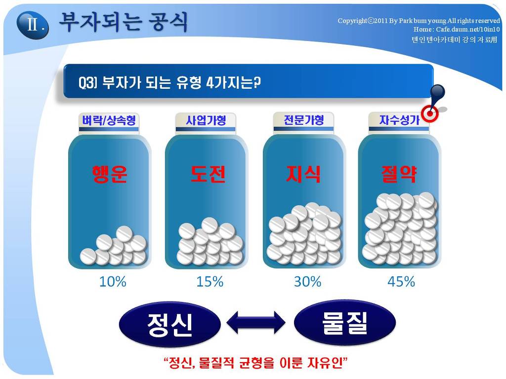다만 각자 개인이 스스로의 타고난 색채를 갖고, 불안한 삶을 유지하는 것이 아닌, 삶의 순간순간 내 삶의 주인으로 감사하고, 평온하게 살수 있는 각자의 재정적 목표를 달성하고자 하는 것입니다. 카페 주인장인 제 자신이 29세(99년)때 목표했던것은 일하지 않고 매월 500만원 시스템을 만드는 것이였습니다. 그렇게 된다면(경제적자유인), 그 이후 삶에서는 제 자신은 노동만 바라보고, 노동만 해야 하는 되는 삶이 아닌, 노동도 할 수 있는 삶으로 전환되는 획기적인 변화인 것입니다. 경제적자유인은 자본주의가 인정하는 자본, 투자로 나 대신이 돈이 자동으로 일하게 만들어, 내 대신 필수적인 수입은 얻게 하고, 나머지 시간은 나아게 가치있는 것들을 할 수 삶을 말하는 것입니다. 결혼했던 99년, 제가 10년 안에 10억의 순자산(텐인텐), 매월 500만원의 소득이 발생하는 시스템은 다른 사람에게는 부자라고 생각되거나, 경제적으로 Free하다고 인정받지 못하더라도,