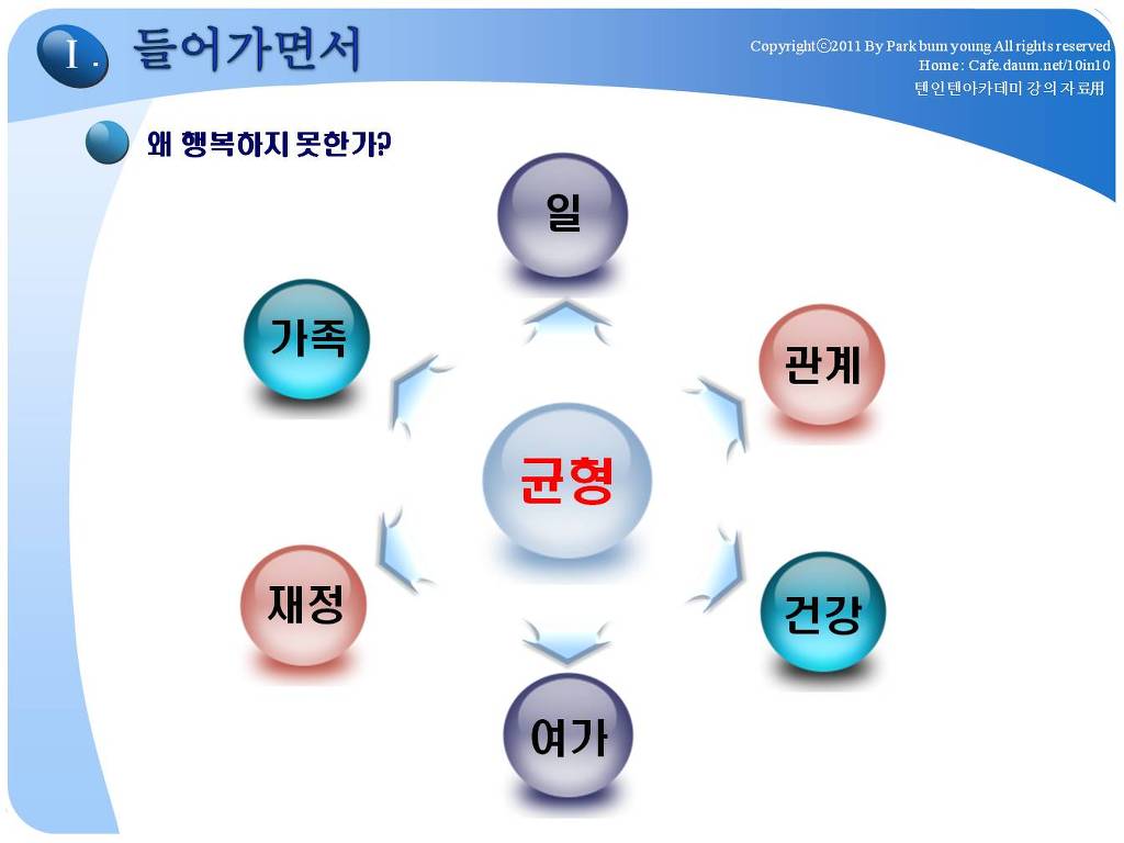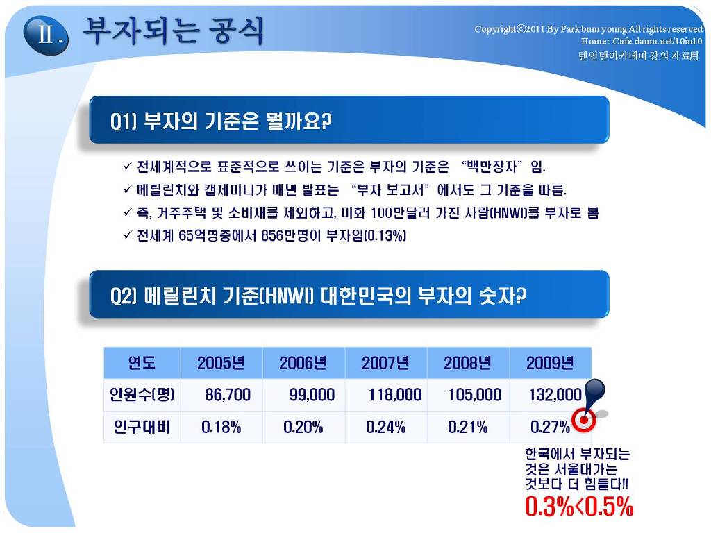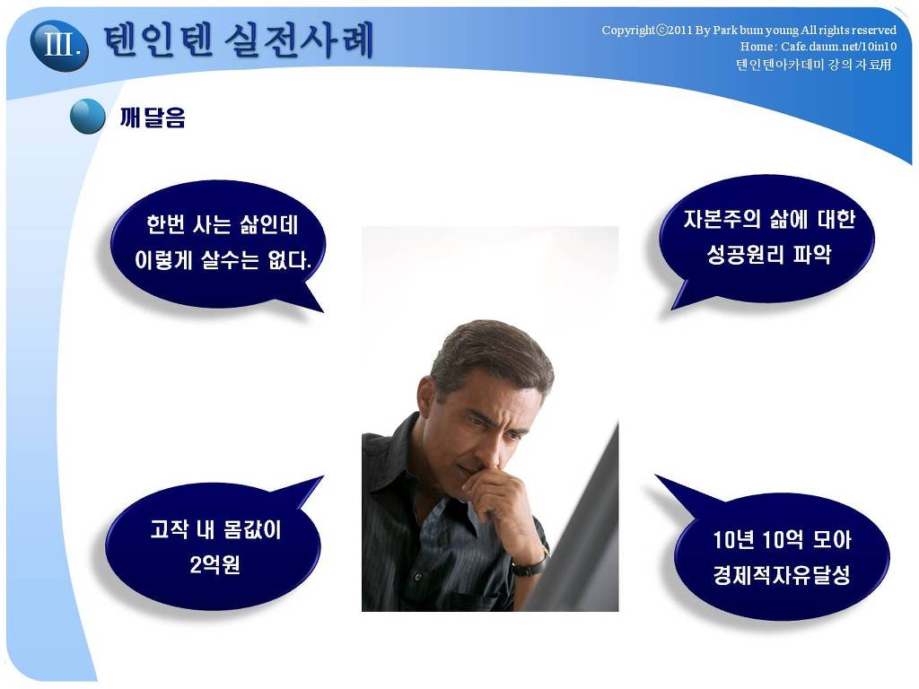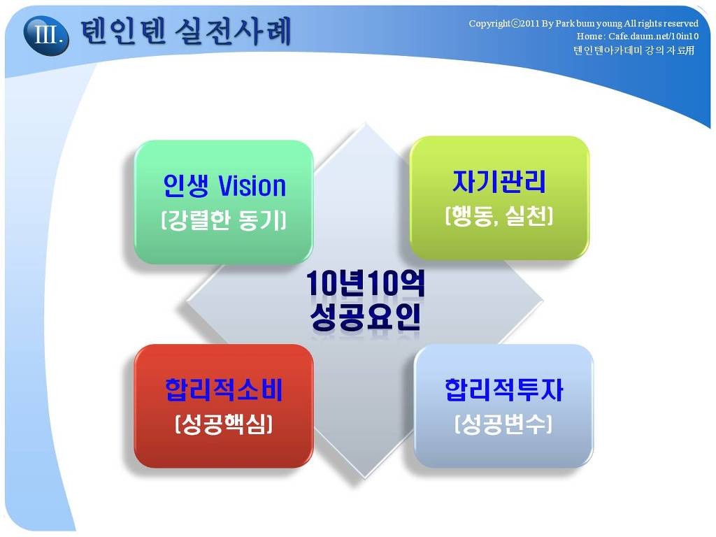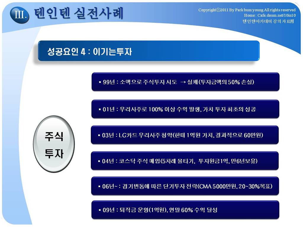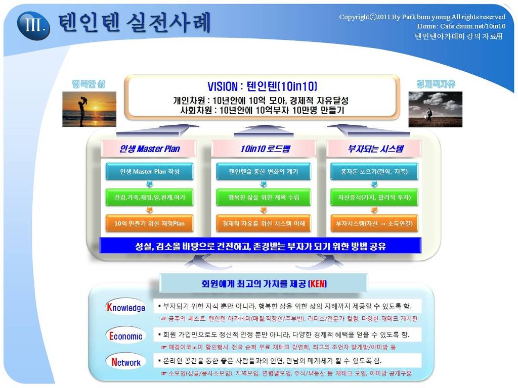 저에게 있어서는 그 정도의 삶의 모습이 "경제적 자유인"이였던 것입니다. 저는 2009년 10년 10억(월500만원)을 이루고 은퇴하였고, 현재 2018년에는 순자산 25억, 월2천만원 이상의 시스템을 유지하고 있습니다. 제가 2001년 만든 텐인텐카페를 여러분들이 어떤 이유로 가입하게 되었는지 모르겠지만, 분명히 제가 이 카페를 만든 원인, 경제적자유인의 가치를 매력적으로 생각하는 분들일 것입니다. 모든 것이 그렇겠지만, 정확한 방향을 모르고 출발하면 헤매이게 되어 있습니다. 카페 주인장이 했던 것을 벤치마킹하는 것은 좋은 출발이 될 수 있을 것입니다. 제가 2009년 은퇴이후, 10년간 진행하고 있는 경제적자유인이 되는 방법에 대한 강의, 경제적자유아카데미에 대한 대략적인 강의 내용입니다.