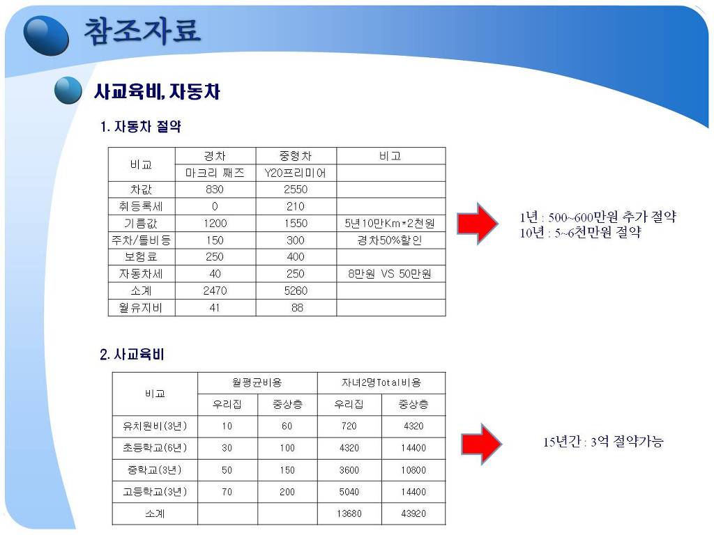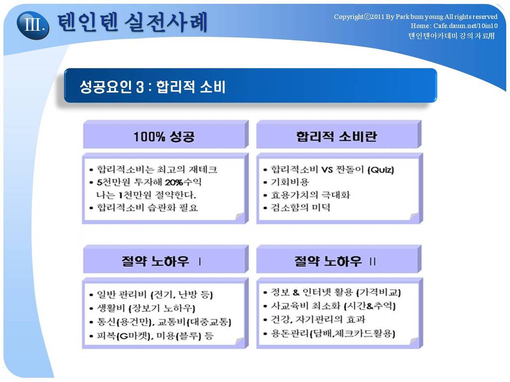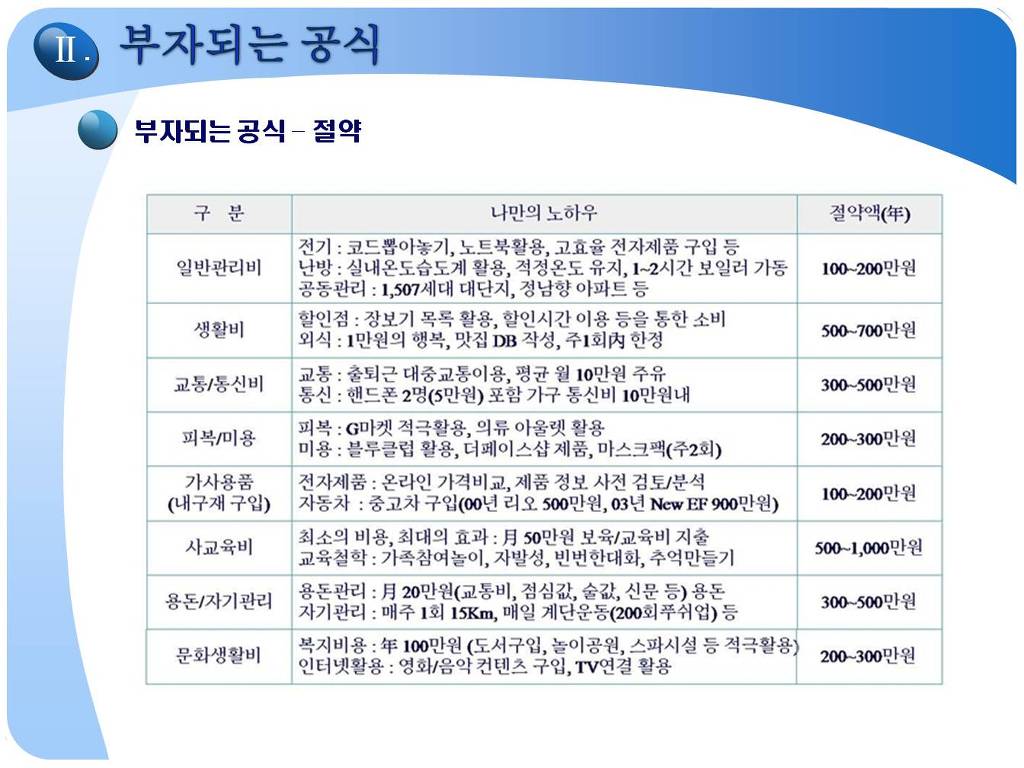 - 세번째 경제적 자유인이 되기 위해서는, 많이 버는 것도 중요하지만 더욱 중요한 것은 주어진 소득범위내에서 어떻게 하면 한푼이라도 더 저축할 수 있는 방법에 실전 이야기, · 일반관리비 : 전기/가스/수도세에 대한 월 5만원 절약하는 구체적 이야기 · 생활비 : 남/녀의 소비습관의 차이, 마트적게강하는 이유, 외식비 절감법등 · 교통/통신비 : 통신비가 많이 나오는 이유, 자동차에 대한 비용 등 절감방법, · 교육비 : 사교육에 의존하는 우리삶의 모순. 자녀교육에 대한 올바른 태도 등