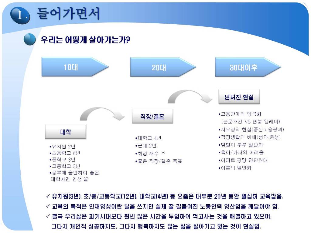 자기자신을 포함해서, 사회적 요구에 맞추어 유치원, 초/중/고등학교 열심히 공부하고, 좋은 대학을 나와서, 좋은 직장에 취업하더라도 우리 삶은 권력/명예/돈과는 거리가 먼곳에서 있을 것입니다.