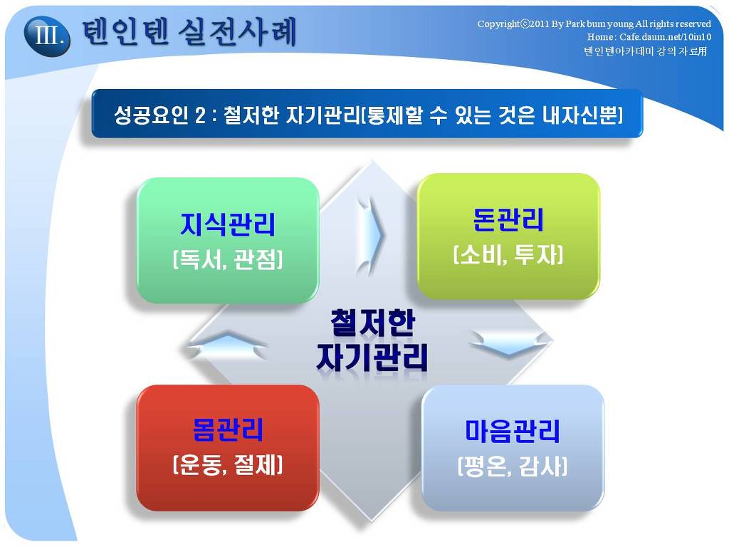 - 두번째 세상에 맞추는 성공이던, 내 자신이 가치롭게 생각하는 곳에서 성공이던, 세상에서 성공을 위해서는 스스로 자기자신을 Control해야되고 그 구체적인 방법으로 몸관리, 지식관리, 돈관리, 마음관리라는 네가지 모듈에서 일상적인 생활속에서 자기관리하는 구체적인 주인장의 방법들에 대한 이야기,