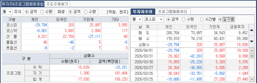 어제까지의 매도가 지수 급등에 따른 '차익 실현'과 '기계적 리스크 관리'였다면, 오늘의 매수는 WGBI 편입이라는 대형 이벤트와 반도체 실적에 기반한 저가 매수세가 고환율의 공포를 이겨낸 결과라고 볼 수 있습니다.