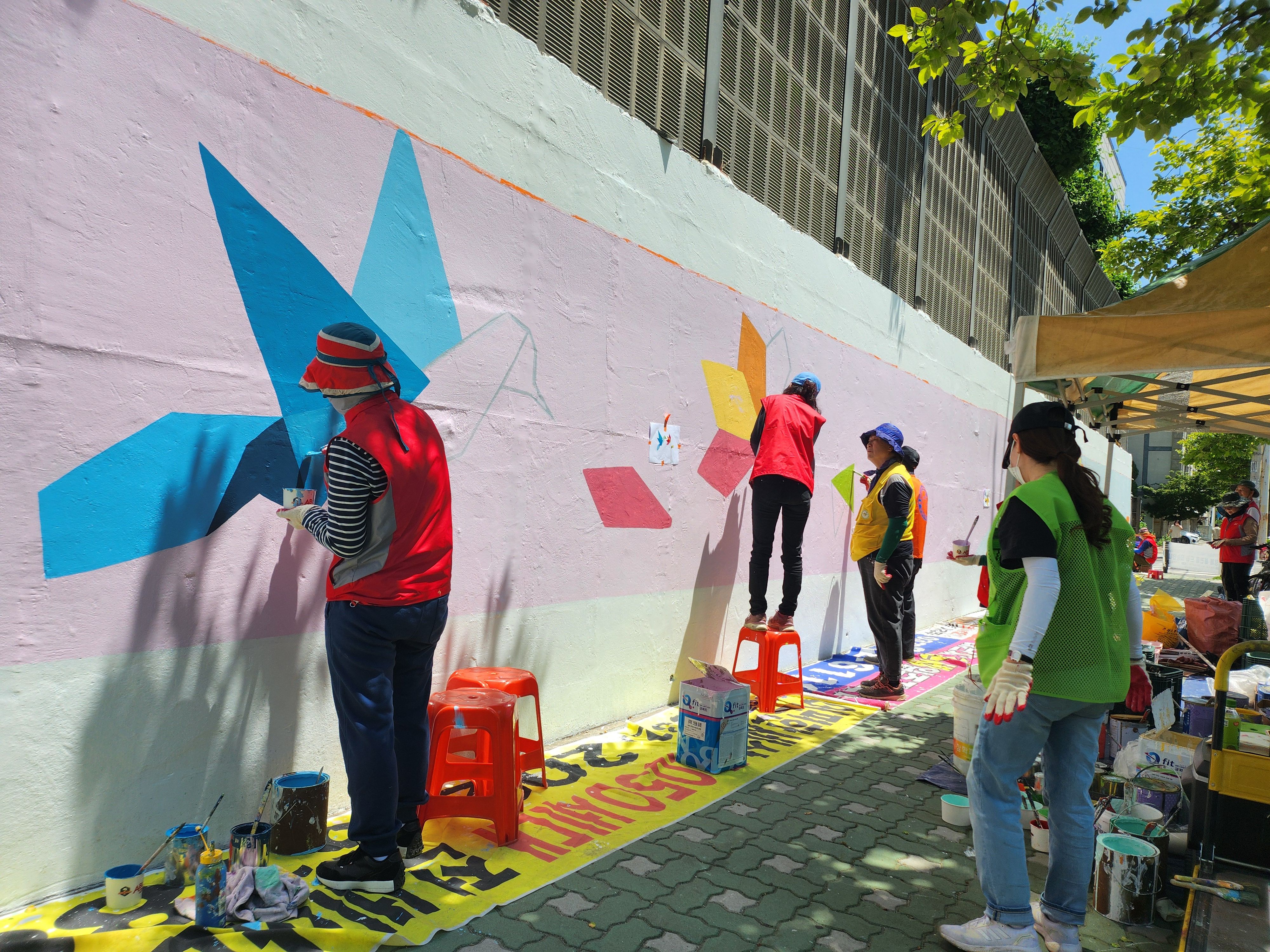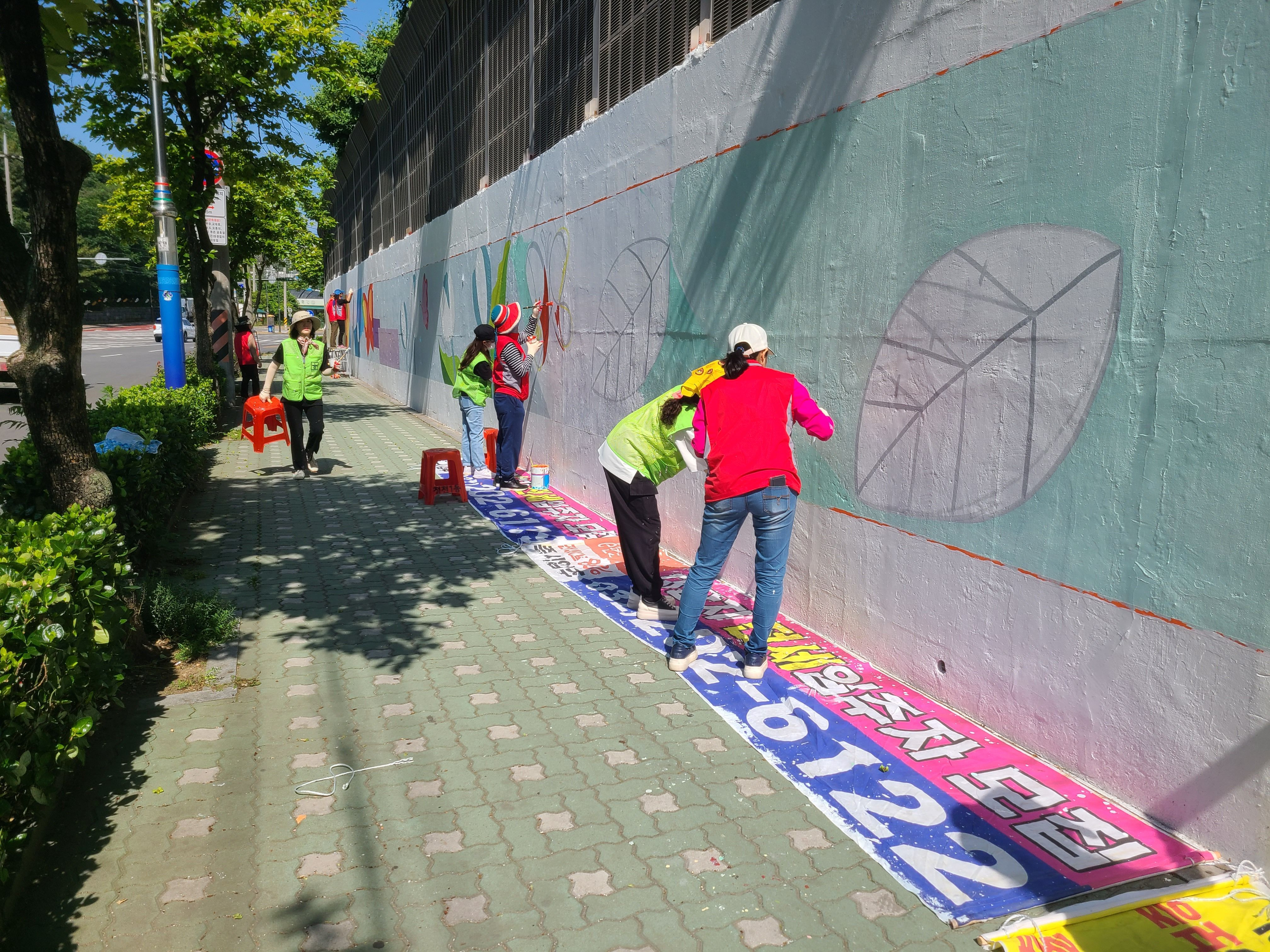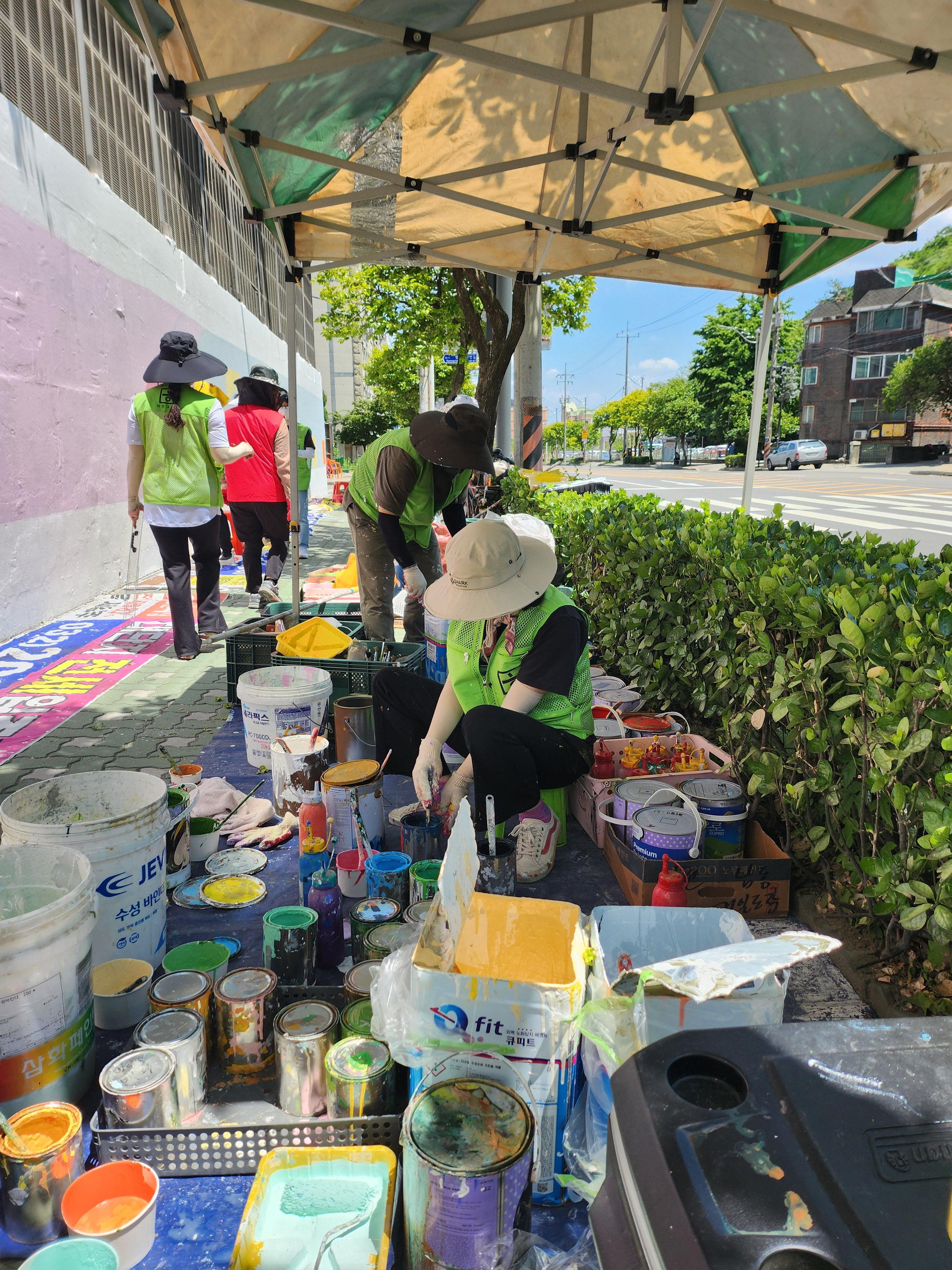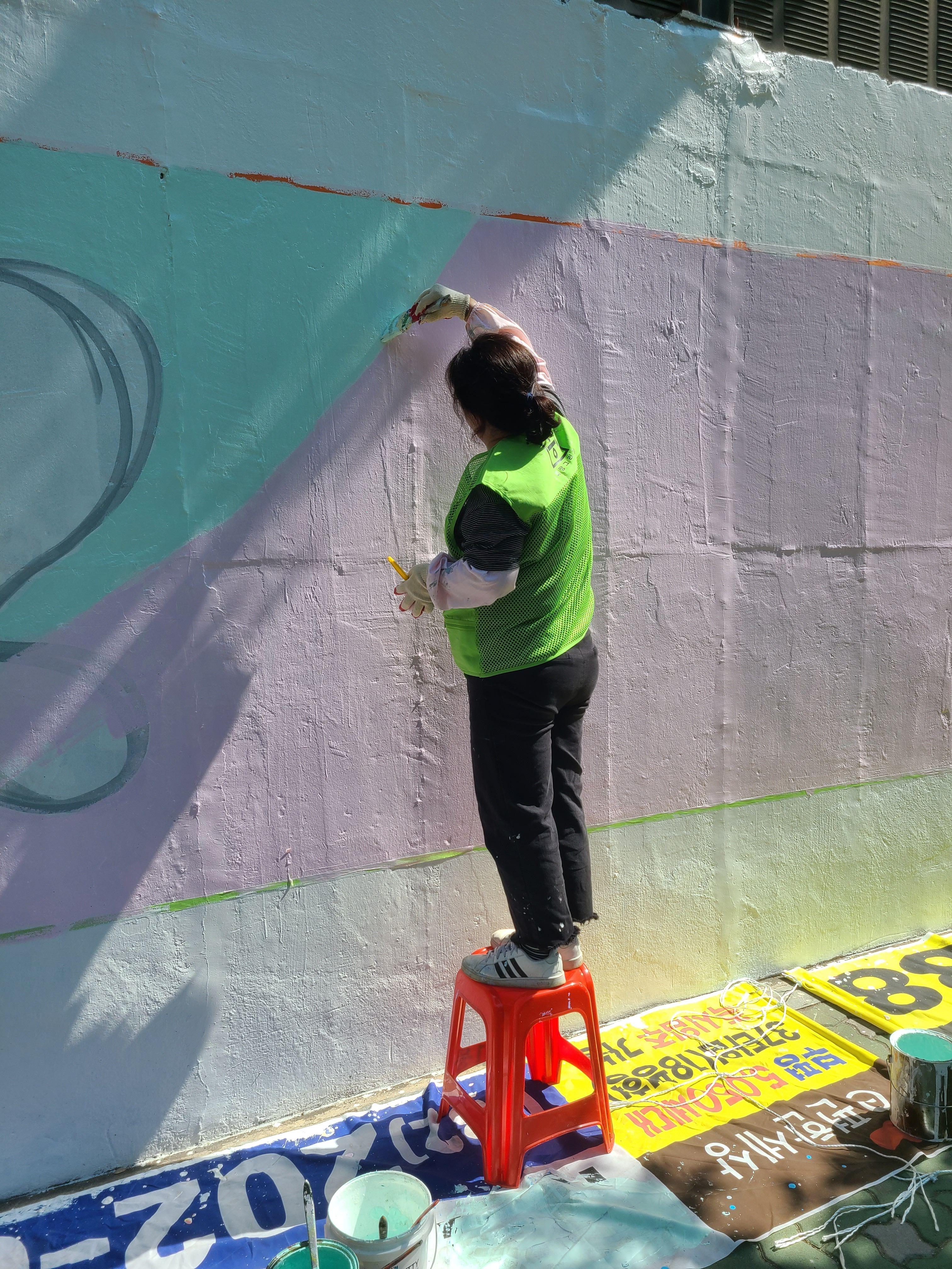 어제 마무리 못한 벽 마무리 중인 주민자치위원회 분들입니다 홍대 미대 형님이 활약하셨습니다.
