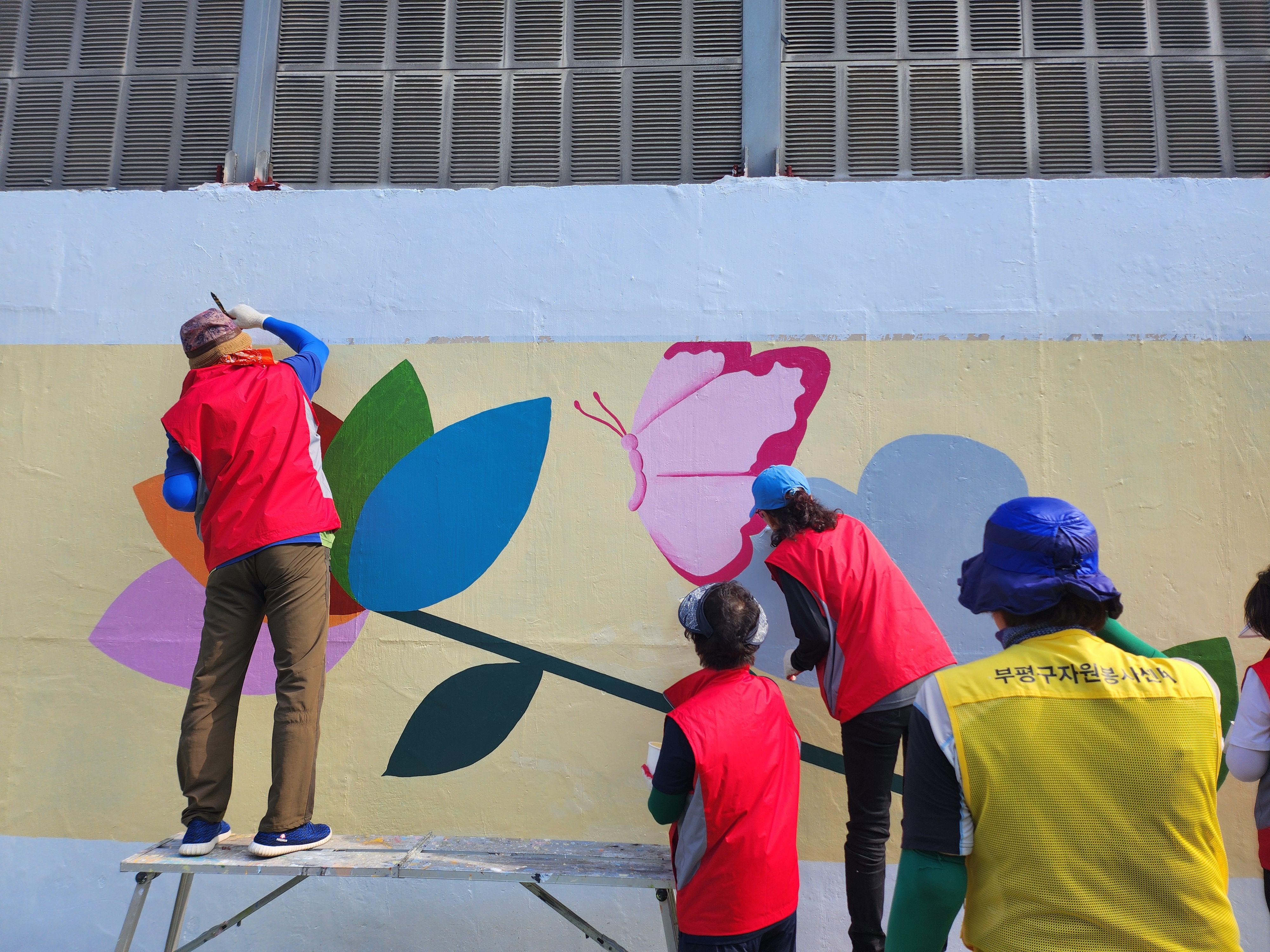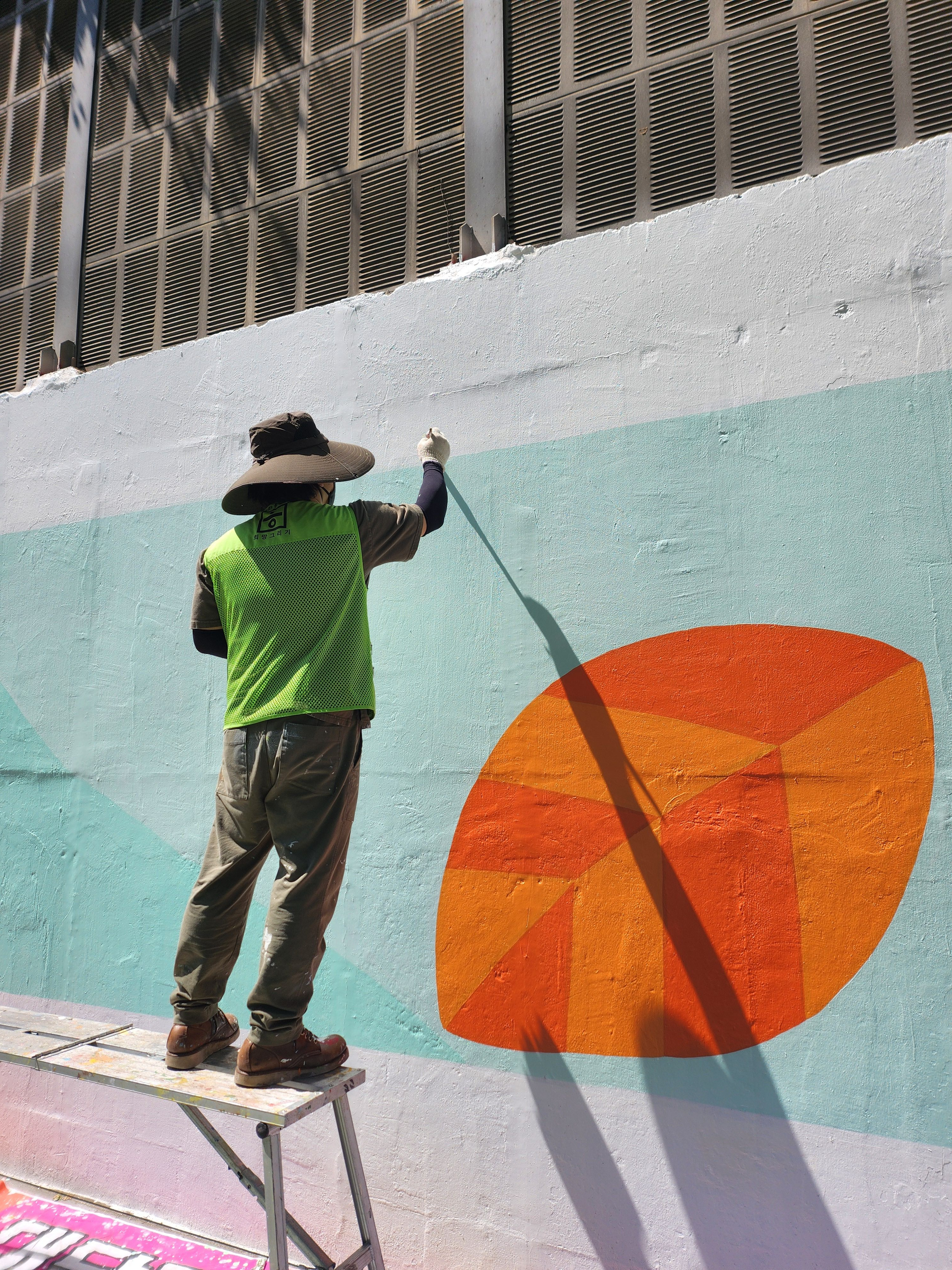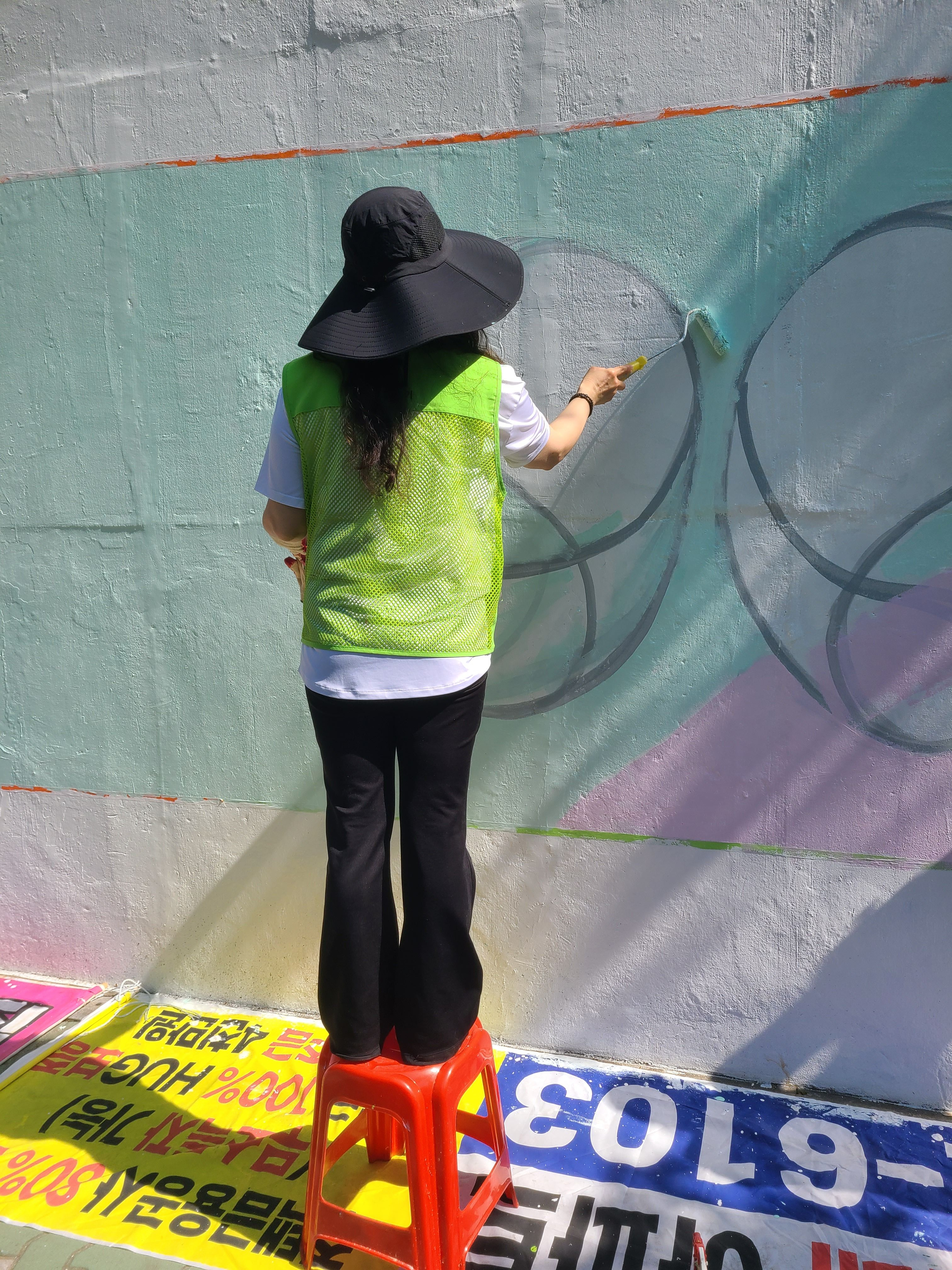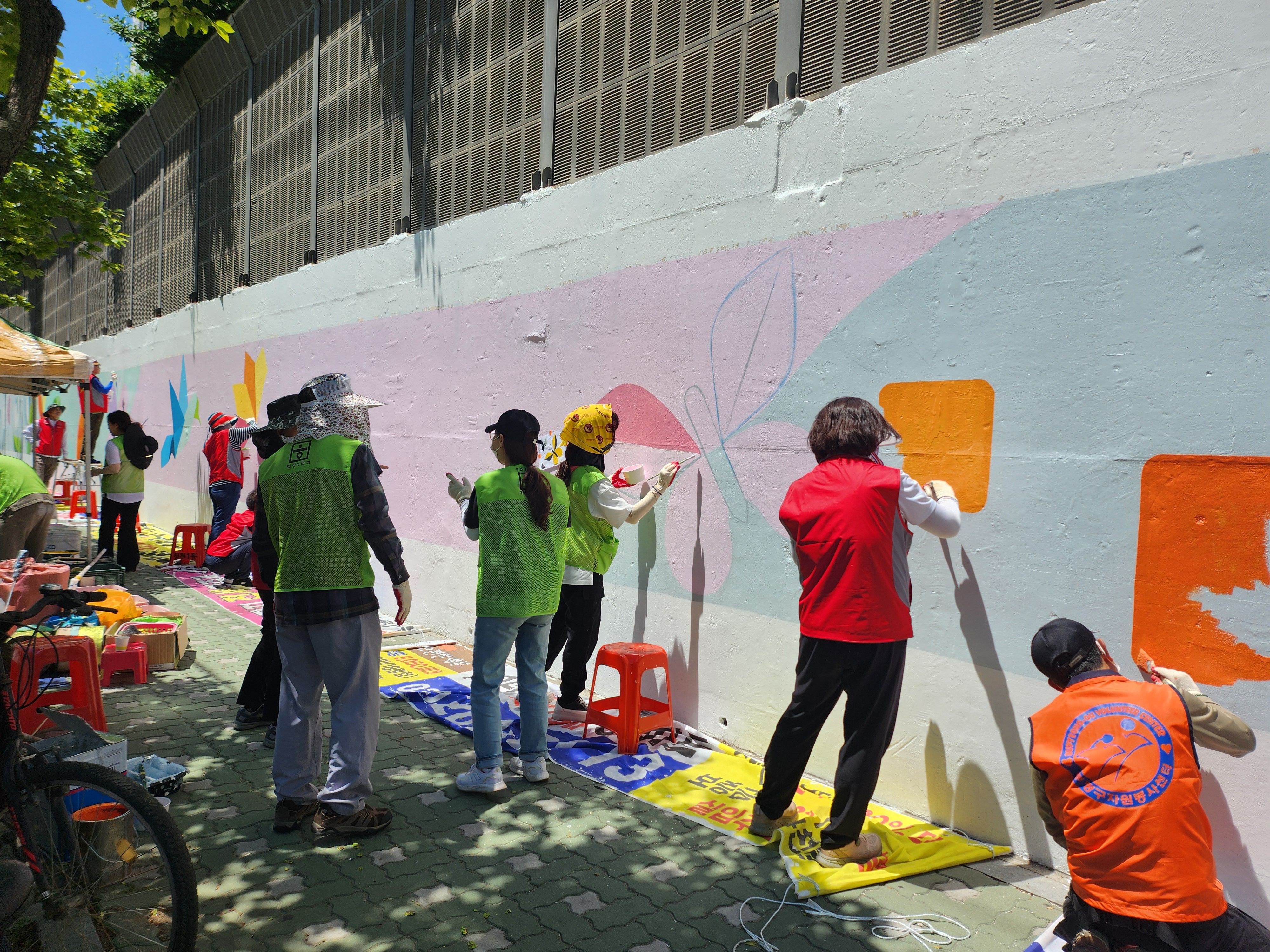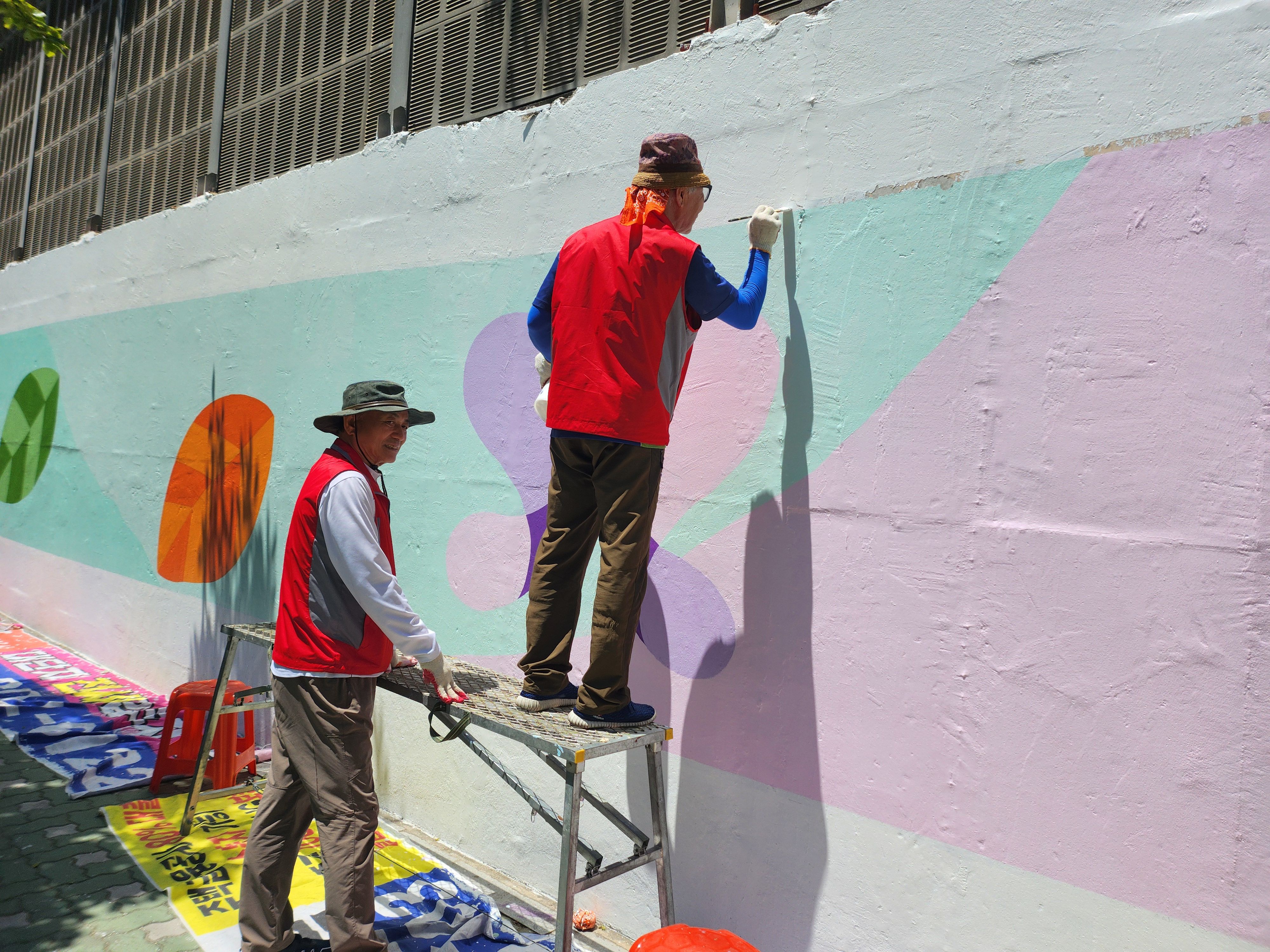 어제 마무리 못한 벽 마무리 중인 주민자치위원회 분들입니다 홍대 미대 형님이 활약하셨습니다.