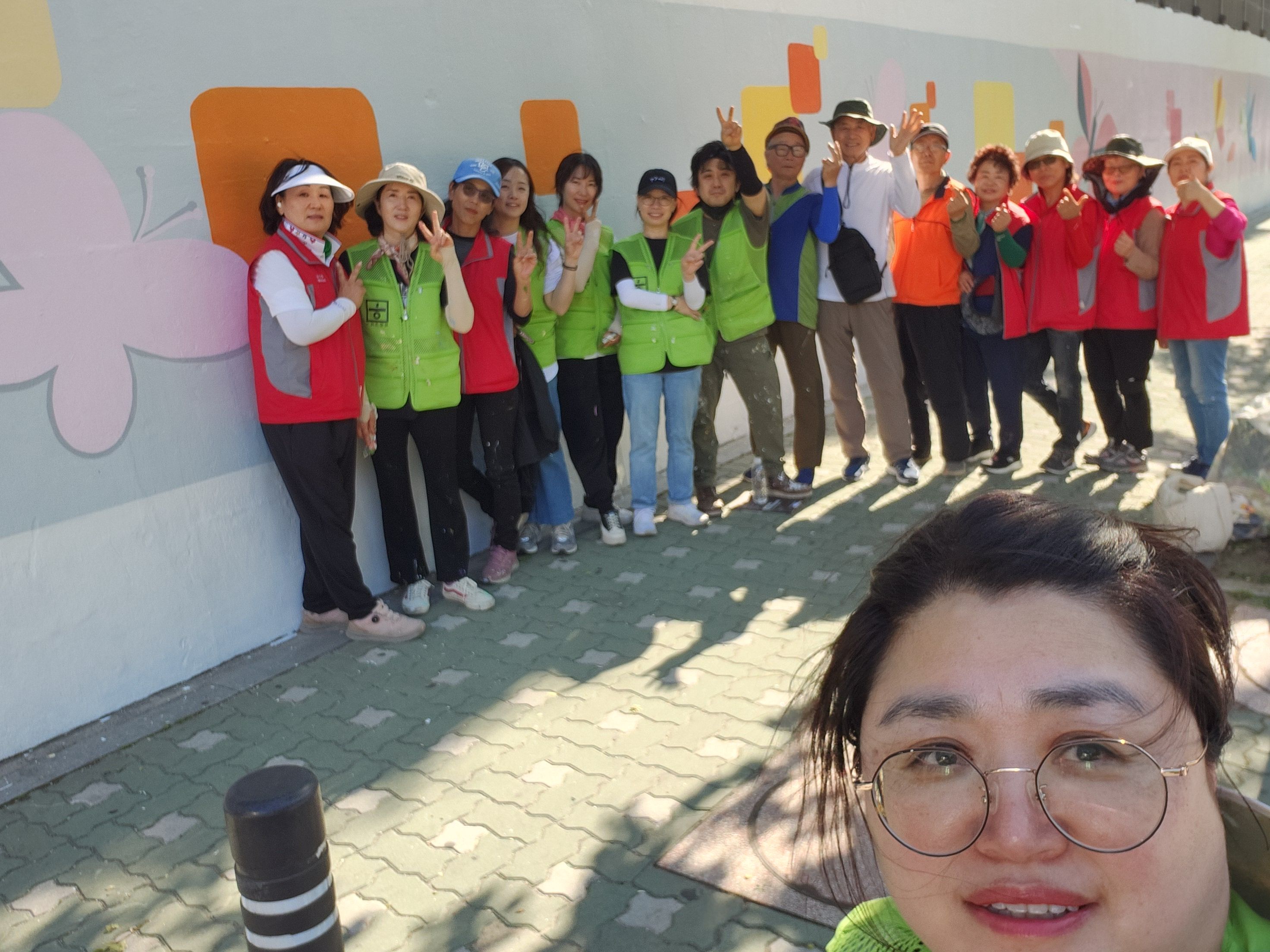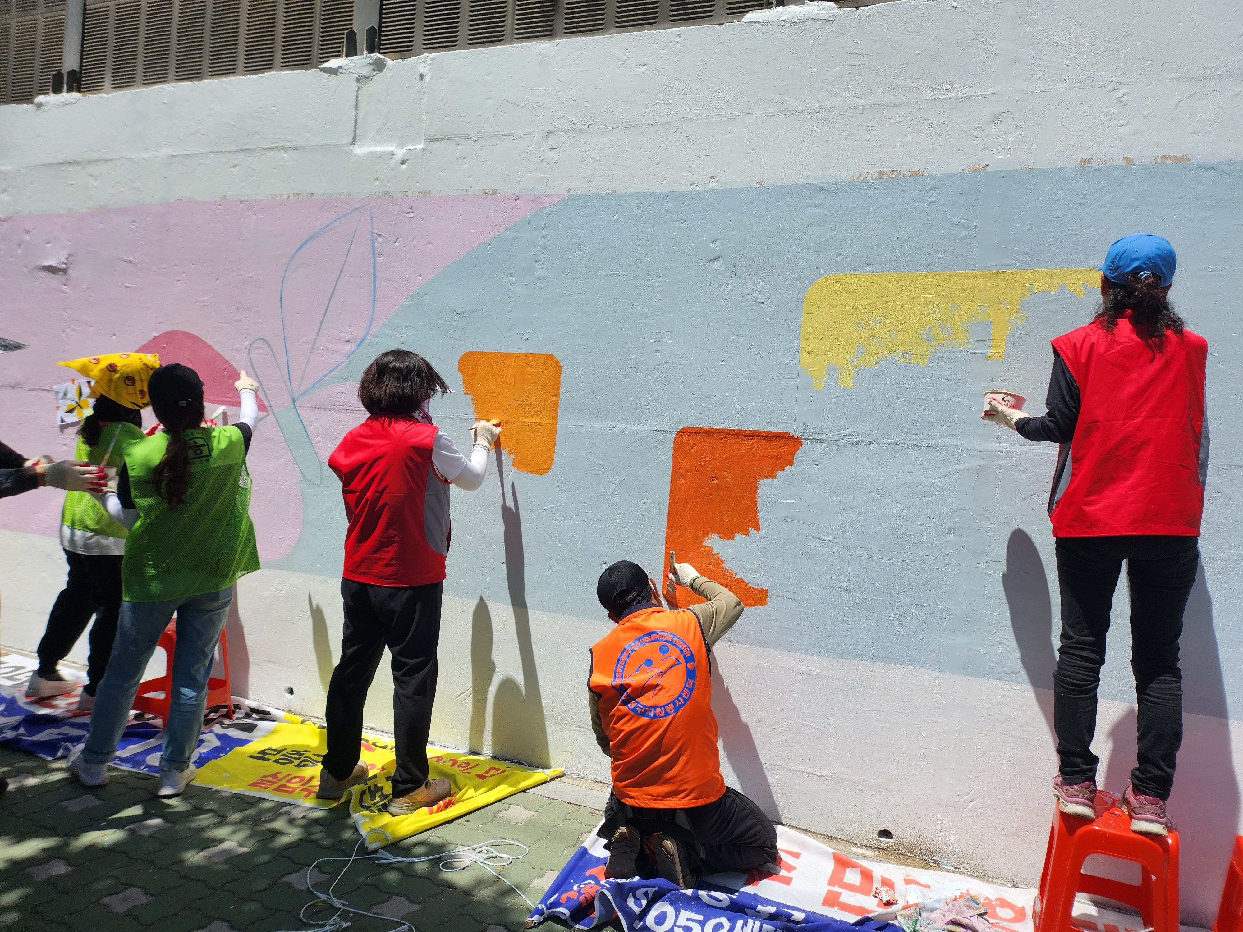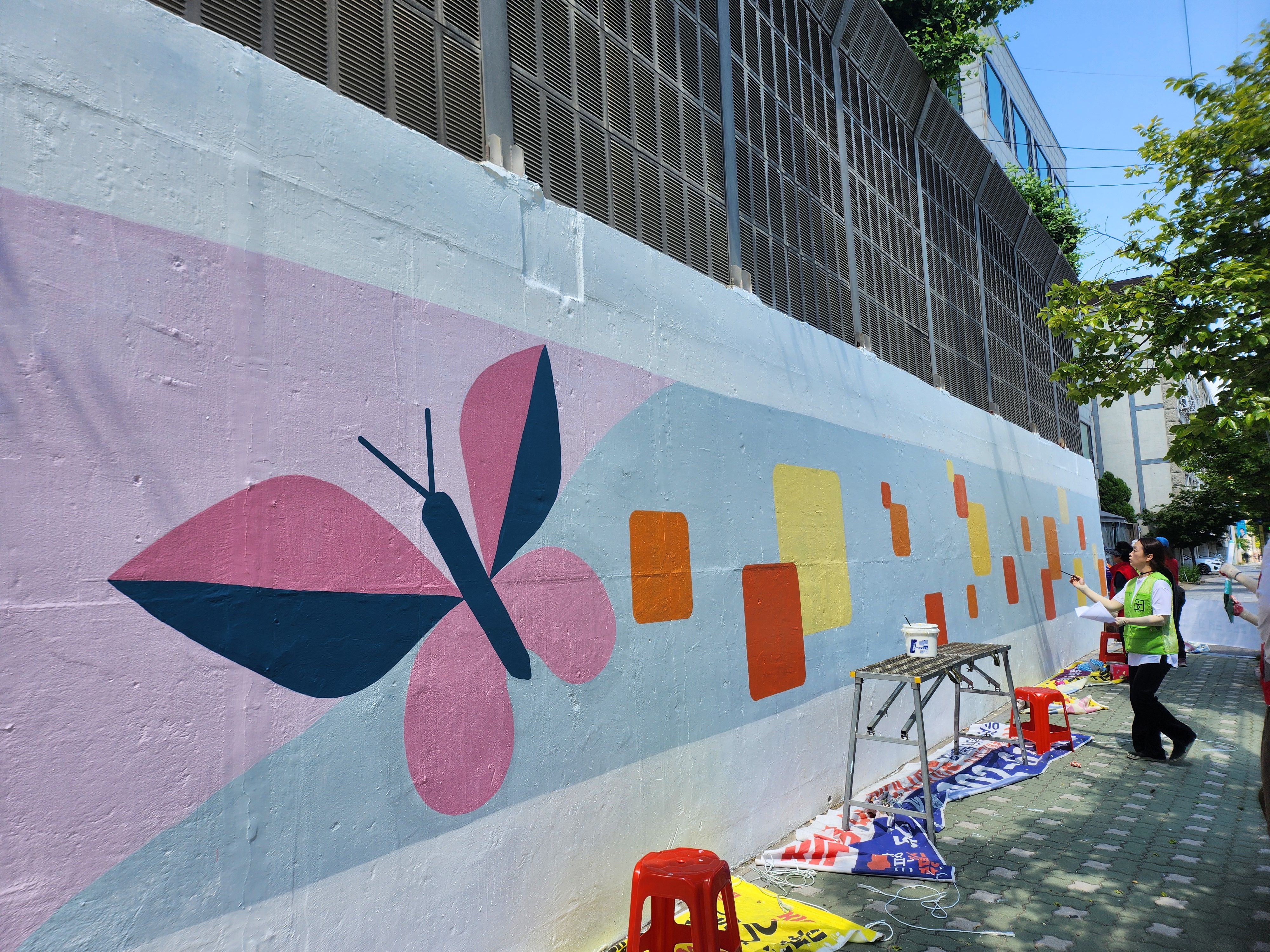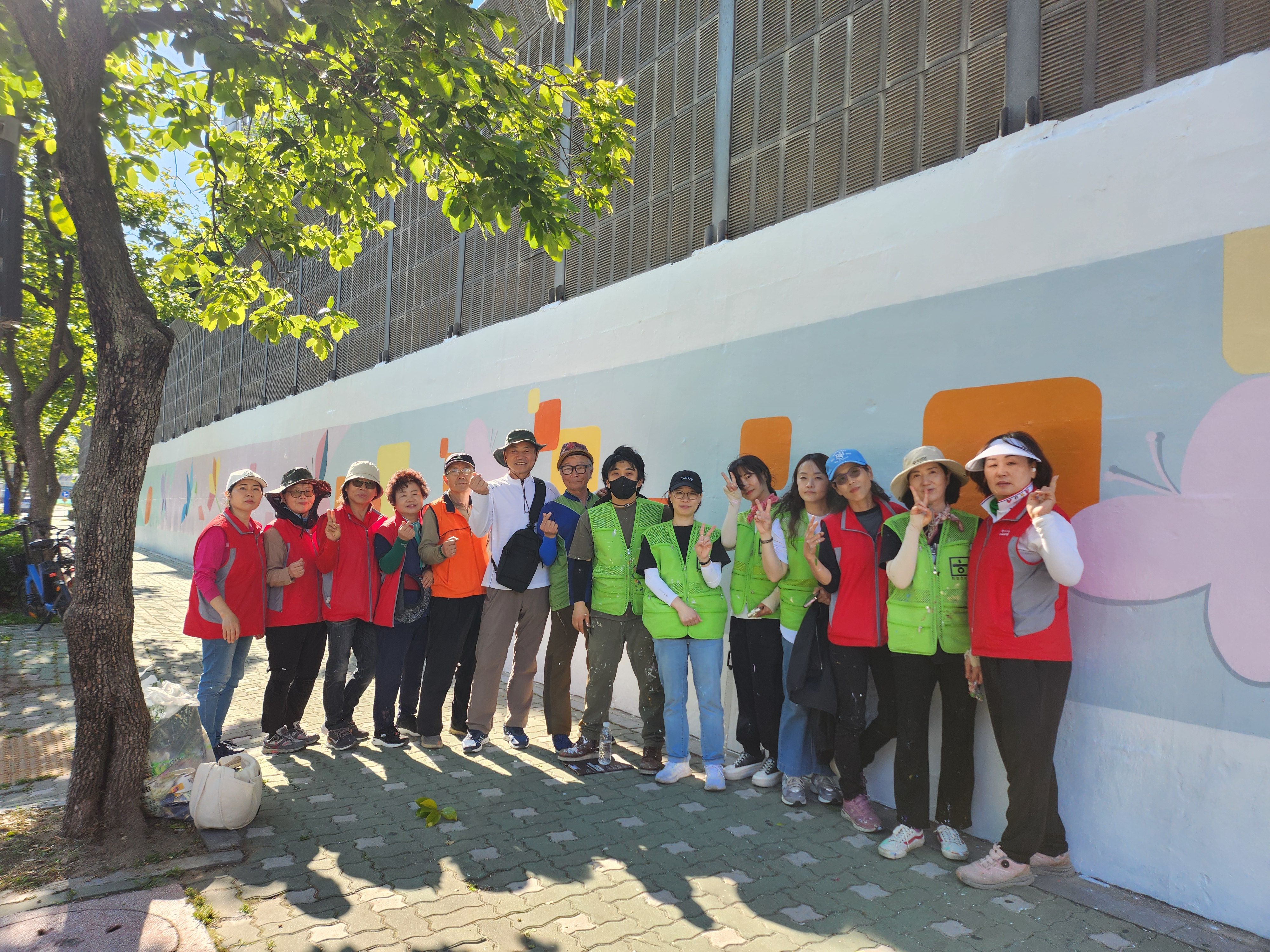어제 마무리 못한 벽 마무리 중인 주민자치위원회 분들입니다 홍대 미대 형님이 활약하셨습니다.