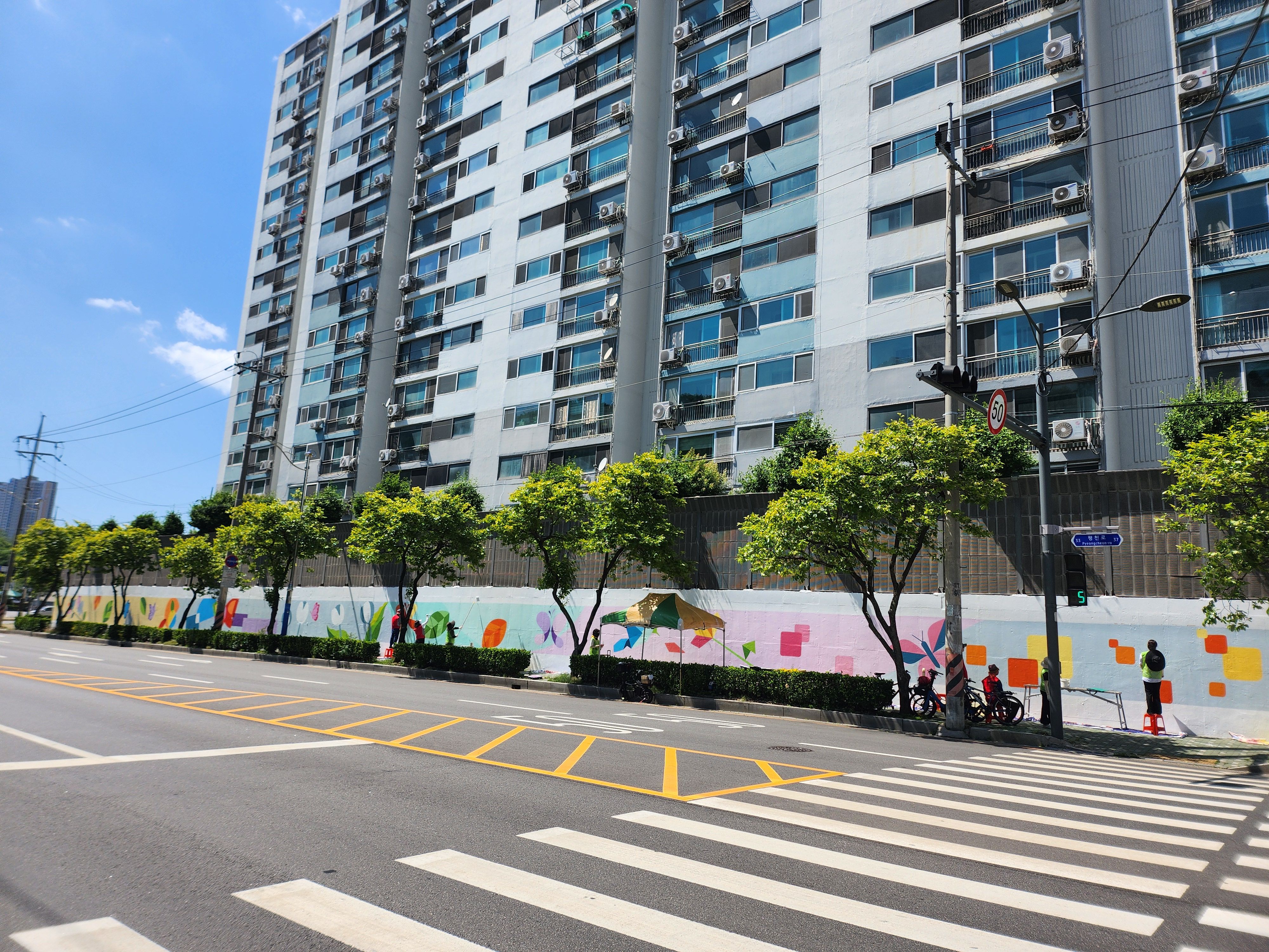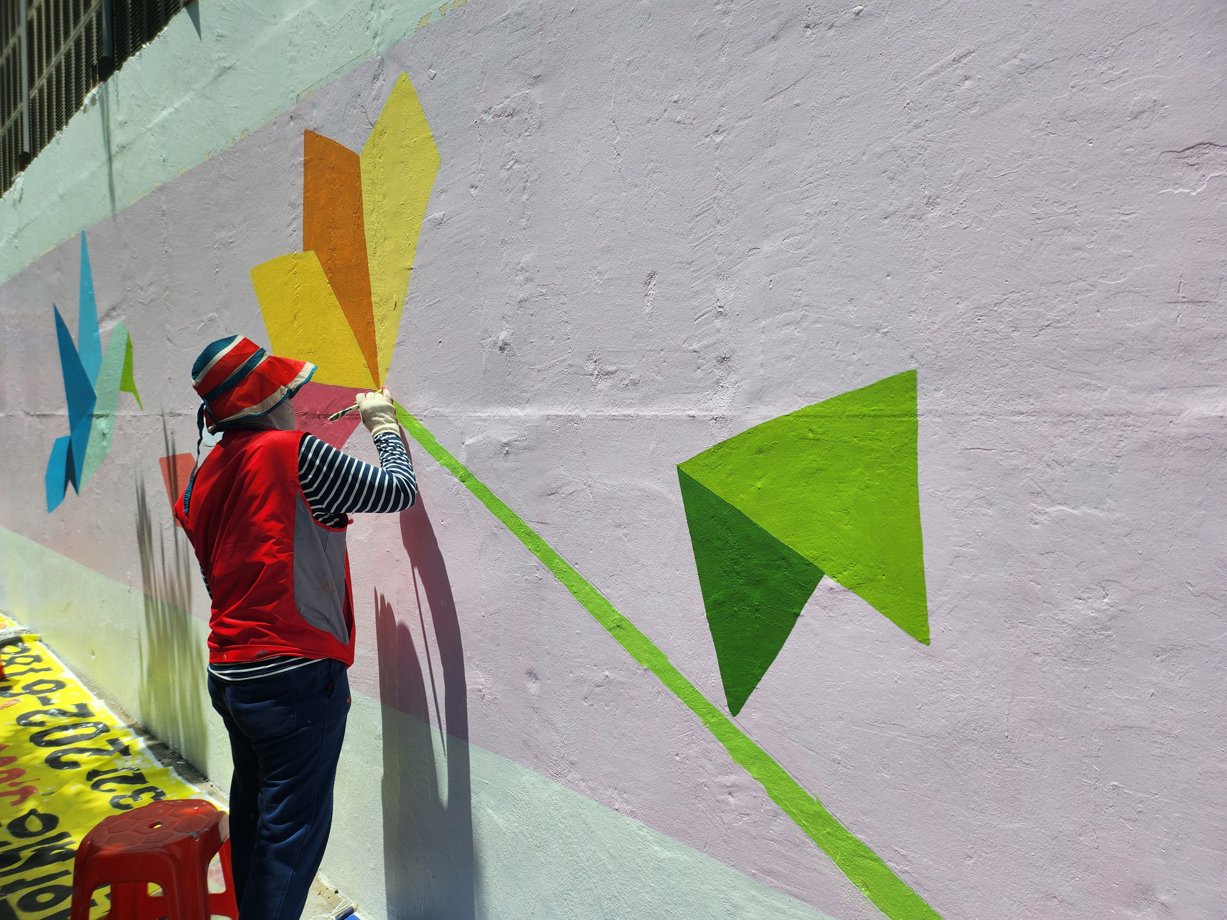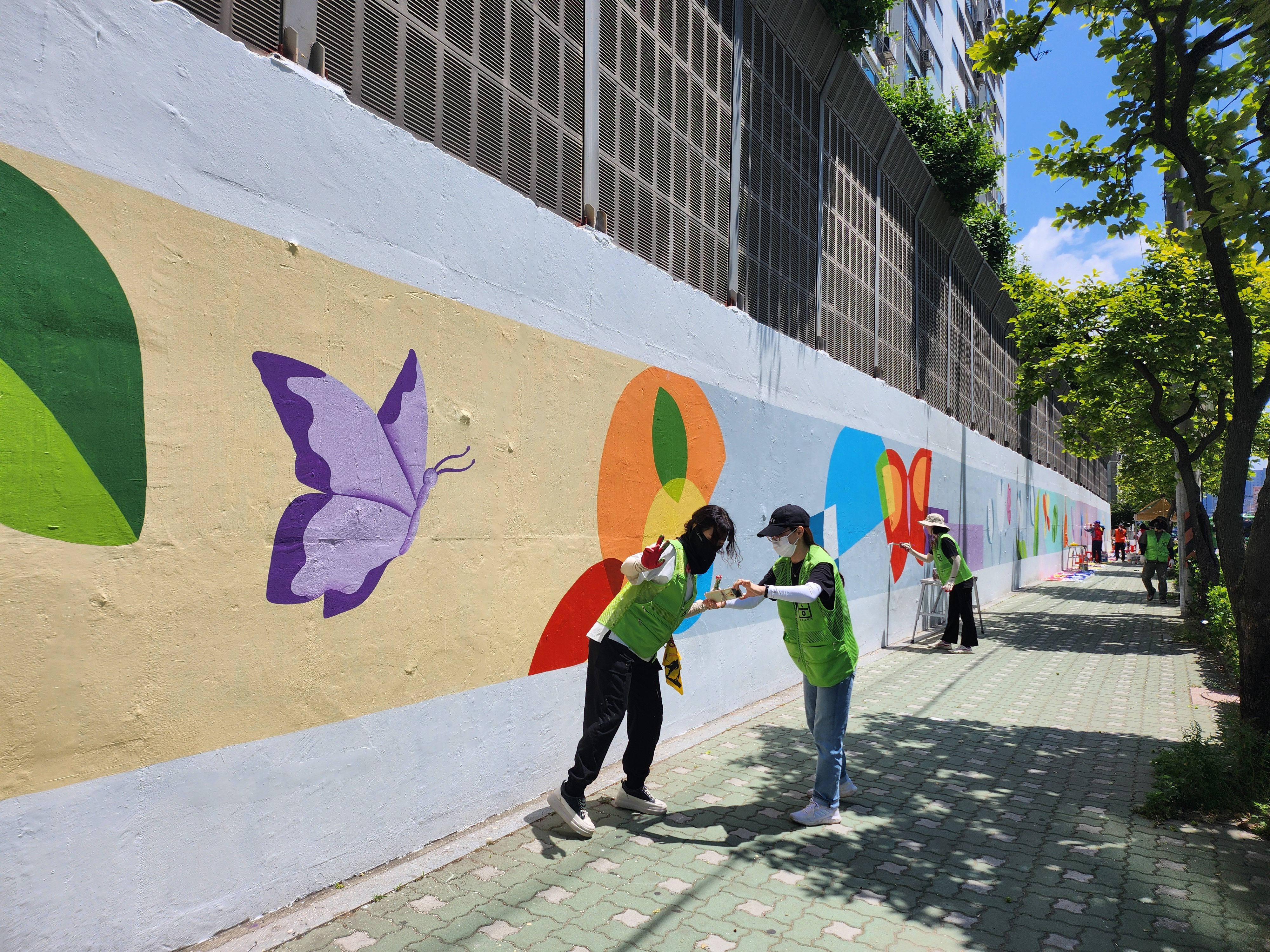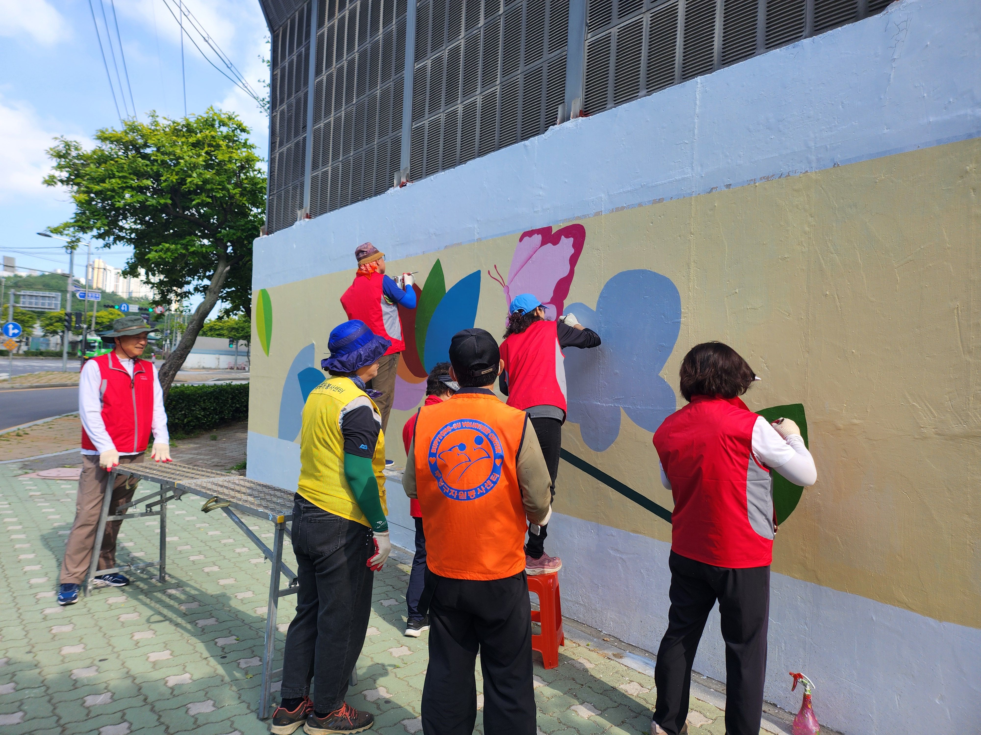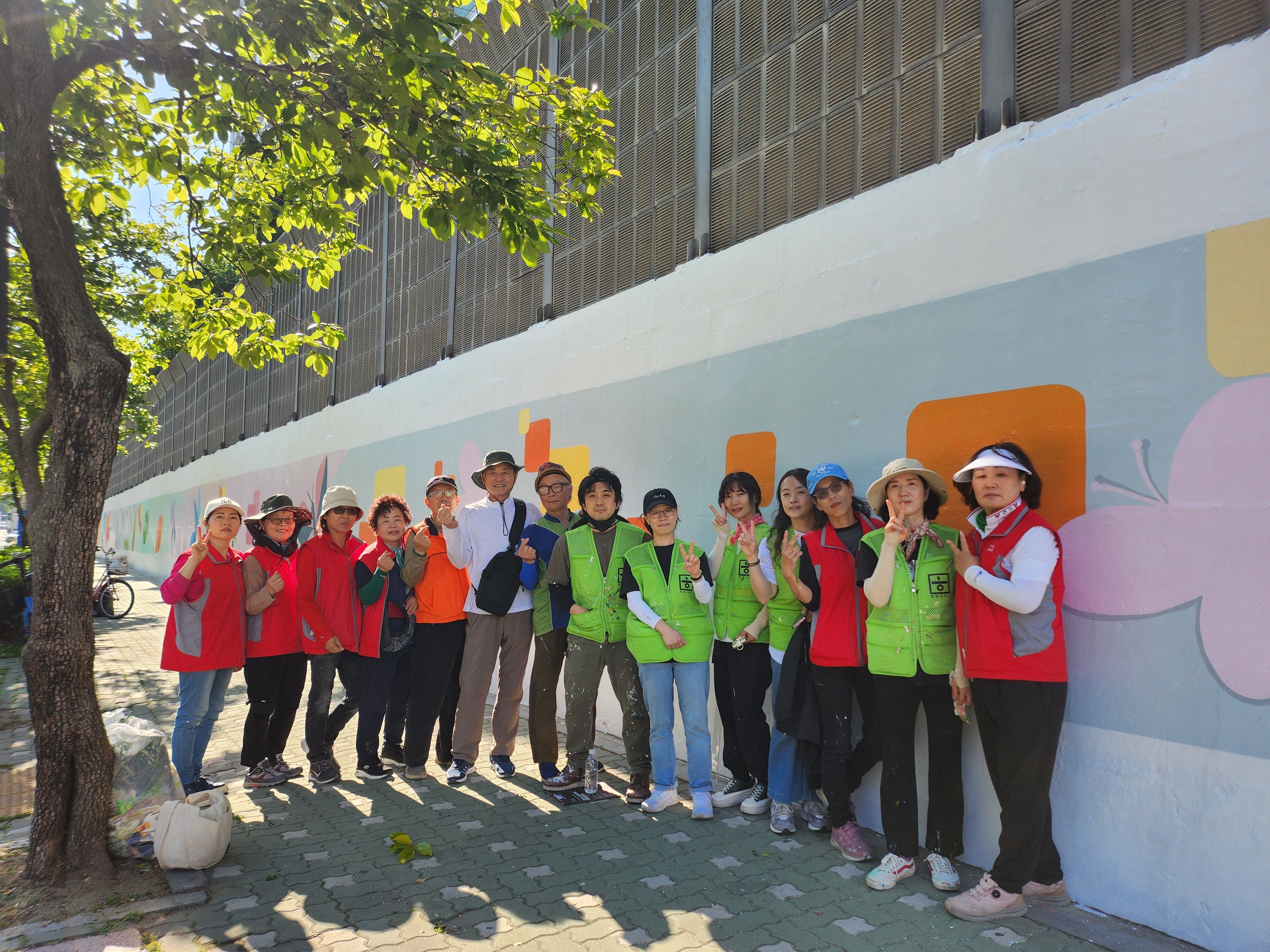 어제 마무리 못한 벽 마무리 중인 주민자치위원회 분들입니다 홍대 미대 형님이 활약하셨습니다.