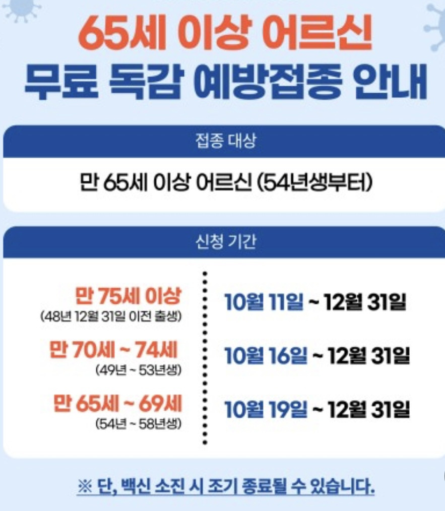 *권고사항:10월11일부터 65세이상/독감무료 백신접종및 코로나19 동시 접종가능