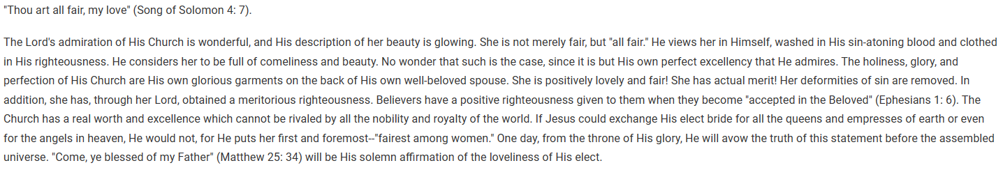 주님의 교회에 대한 주님의 감탄은 정말 놀랍고, 교회의 아름다움에 대한 표현은 참으로 열정적입니다. 교회를 단지 어여쁘다고만 말하시지 않고 "순전히 어여쁘다"고하십니다. 주님은 그의 속죄의 보혈로 깨끗이 씻음 받고 그의 의로 옷 입고 있는, 자기 자신 안에 있는 교회를 보십니다. 주님의 교회를 예쁨과 아름다움이 충만하다고 생각하십니다. 사실이 그런 것은(즉 주님이 교회를 이처럼 예쁘게 보시는 것) 이상한 일이 아닙니다. 왜냐하면 주님이 감탄하시는 것은 다만 그 자신의 완전한 탁월성(빼어남) 때문입니다.