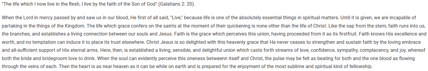 그 영혼이 그 자신과 그리스도 사이의 이 하나됨을 분명히 알게 되면, 그 맥박은 서로를 위하여 고동 치는 것을 느끼게 되고 한 피(그리스도의 피)가 각기의 혈관을 통하여 흐르는 것을 느끼게 될 것입니다. 그때 그 심령은 이 땅에 있는 동안 더 할 나위 없이 가장 천국에 가까이 있습니다. 그래서 가장 숭고한 영적교제의 기쁨을 누릴 준비가 되어 있습니다.