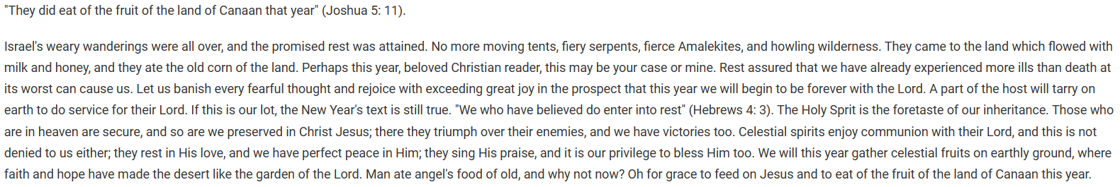 우리는 금년(새해)에 믿음과 소망이 사막(황야)같은 이 세상을 주님의 동산(에덴)같이 변화시킨 이 지상에서 하늘 소산물(celestial fruits, 신령한 곡식)을 거둘 것입니다. 아담(Man)은 천사의 옛 음식을 먹었습니다. 그렇다면 지금(그리스도 안에 있는) 우리는 왜 못먹겠는가? 오! 예수로 살고, 가나안 땅의 이 해의 소산을 먹는 은혜여! (역자주: 새해를 맞아 이스라엘이 가나안에 도착하여 새 땅의 곡식을 먹었듯이 우리 그리스도인은 영적 가나안인 그리스도안에 살며 그리스도의 영적곡식을 먹어야 할 것을 은유한 메시지이다.)