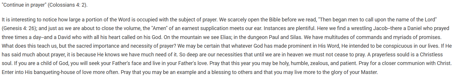 만일 하나님이 기도에 관하여 많이 말씀하셨다면 그것은 하나님이(우리에게) 기도의 필요성이 그만큼 크다는 것을 아시기 때문입니다. 우리의 기도의 필요성이 너무 절실(切實)하기 때문에 하늘나라에 들어가기까지 우리는 기도를 그쳐서는 안됩니다. 기도없는 영혼은 그리스도 없는 영혼입니다. 그대가 하나님의 아들이라면, 그대는 하나님의 얼굴을 찾아서 뵙고 하나님 아버지의 사랑 안에 살 것입니다. 올해 그대는 거룩하고, 겸손하고, 열성적이고, 인내성 있는 그리스도인이 되기 위하여 기도하십시요. 예수 그리스도와 더 가까운 친교를 위하여 기도하십시요. 자주 주님의 사랑의 연회장으로 들어 가십시요(역자주6) 그대는 다른 이에게 본이 되고 축복이 되고, 더욱 그대의 주님의 영광을 위해 살기 위하여 기도하십시요.