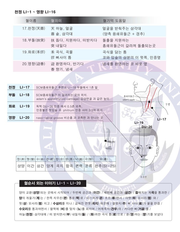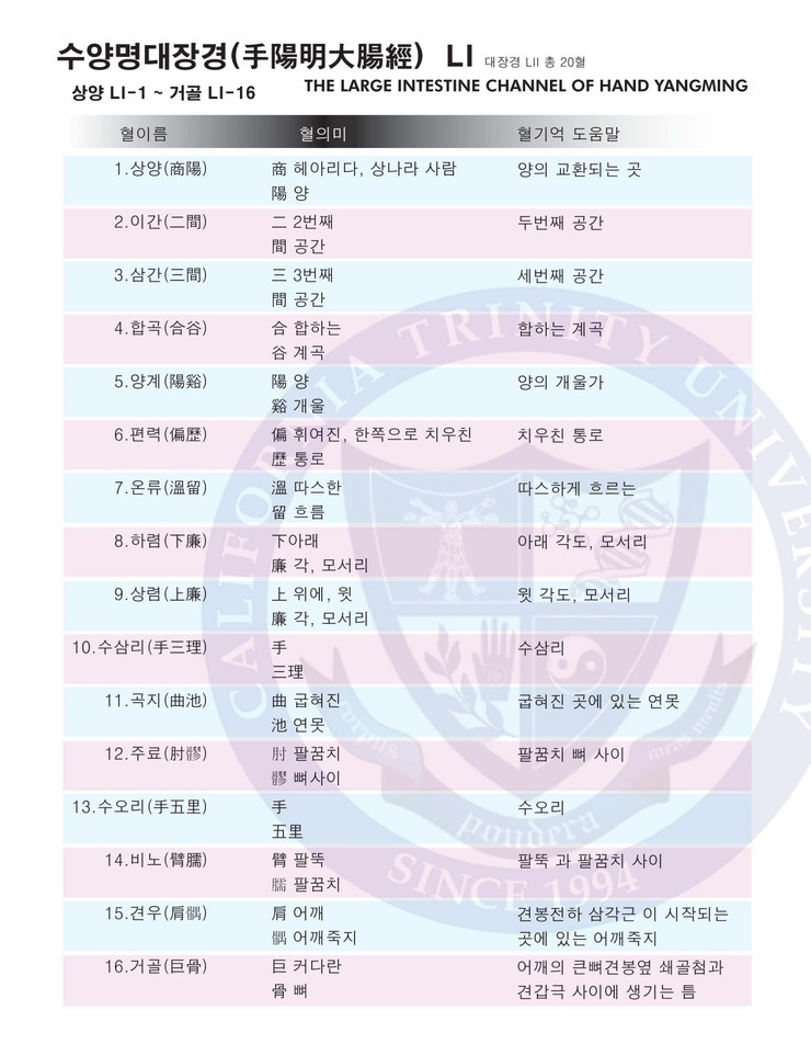 미국 LA에 있는 CALIFORNIA TRINITY UNIVERSITY 한의과 대학 총장님께서 직접 쓰신 내용입니다. 혈자리 외우는 것이 어렵고 복잡한 분들에게 너무나도 좋은 자료입니다.