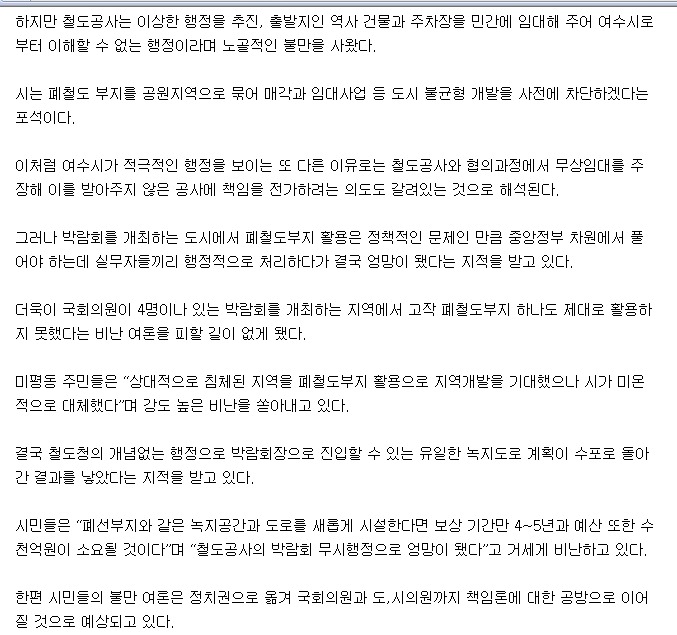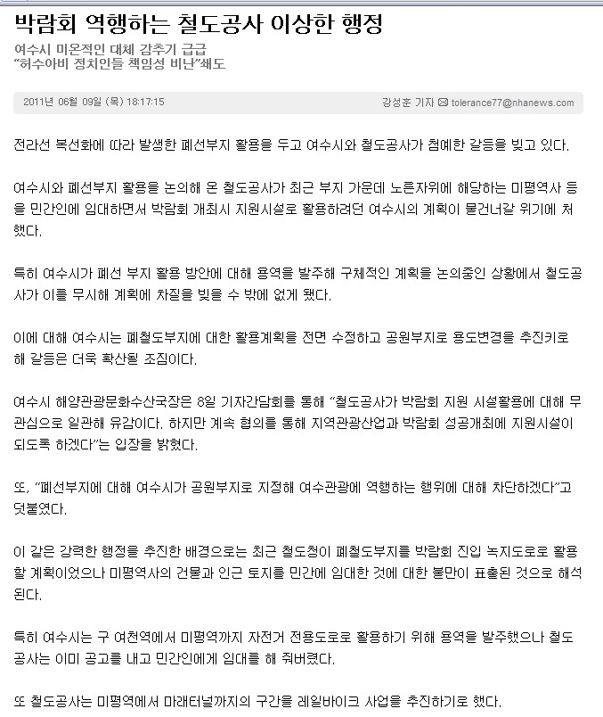 여수시 박람회역행 폐선부지 활용방안 작성자미래투자|작성시간11.06.11|조회수11 목록 댓글 0 글자크기 작게가 글자크기 크게가 다음검색 현재 게시글 추가 기능 열기 북마크 공유하기 신고 센터로 신고 댓글 댓글 0 댓글쓰기 답글쓰기 댓글 리스트