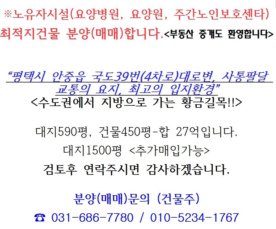 노유자시설(요양병원, 요양원, 주간보호센터) 최적지건물 분양(매매)합니다. 부동산중개도 환영 작성자조규복|작성시간16.10.28|조회수50 목록 댓글 0 글자크기 작게가 글자크기 크게가 다음검색 현재 게시글 추가 기능 열기 북마크 공유하기 신고 센터로 신고 댓글 댓글 0 댓글쓰기 답글쓰기 댓글 리스트