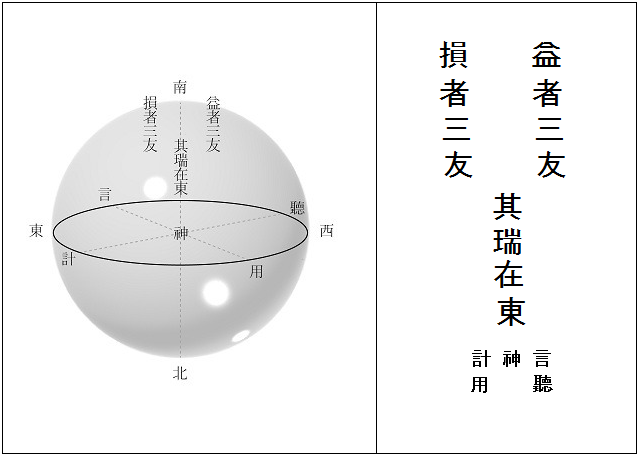 익자3우(益者三友) 손자3우(損者三友)가 좌우로 놓여 져 있고 기서재동(其瑞吊)이 중(中)을 나타내며 또 익자삼우와 손자삼우와 기서재동은 글자의 크기가 같다. 언청계용(言廳計用)은 동서남북을 나타내고 그 중심에 신(神)이 놓여 있다. 전체로 볼 때 상중하 3부분으로 구분되고 또 좌중우의 3부분으로 구분된다. 기서재동은 상중하의 중이고, 상중하의 중과 좌중우의 중은 신(神)이 된다.