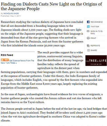 일본의 다양한 방언을 분석해보니, 현재의 일본어가 유래한 것은 일본에서 3만년 전부터 거주하던 수렵·채집인이 아니라, 2200년 전 한반도에서 건너간 농경인이라는 요지이다.