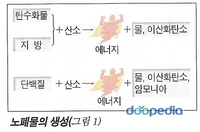 생물체가 섭취한 음식물 가운데 탄수화물과 지방은 분해되어 이산화탄소와 물이 생성되고 단백질은 이산화탄소와 물 이외에 암모니아, 요소, 요산 등의 질소를 함유한 노폐물이 생긴다.
