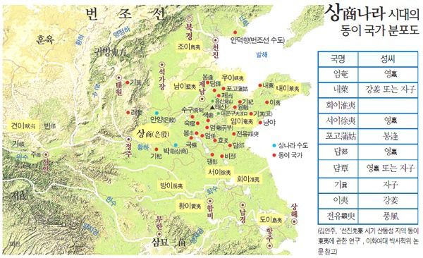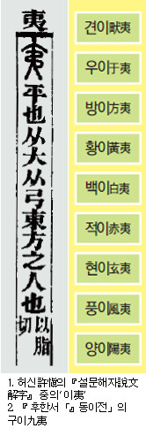 홍산문화의 주인공이기도 했던 동이는 동북아 일대로 그 영역이 확대되었는데 고대 황하문명의 중심지들도 모두 이 동이의 영역에 들어갑니다. 동이의 일부는 요령성 서부에 와서 한 갈래는 동북으로 다른 한 갈래는 발해를 따라 내려와 산동반도로 진출하였습니다. 즉 신석기시대 말기부터 동이족들은 회하 유역과 산동반도에 걸치는 중국 동해안 일대, 남만주, 발해만 일대, 한반도 북부에 걸쳐 거주하였는데 이들이 세운 나라가 배달에서 단군조선으로 이어졌습니다. 단군조선은 동이문화권의 중심을 형성하였습니다. 그리고 황하 유역의 동이는 은나라를 세워 중국 고대문명의 기초를 놓았는데 그 문화가 대부분 주나라를 비롯한 한족에 의해 계승되어 화하문명으로 꽃피게 된 것입니다. 흔히 동이라 하면 남만, 북적, 서융과 함께 중국 주변의 오랑캐다, 그렇게들 알고 있는 경우가 많습니다. 중국인들은 처음에는 동이를 오랑캐로 생각한 것이 아니라 뛰어난 문명을 가진 사람들로 생각했습니다. 사실 동東이란 글자는 태양이 떠오르는 광명의 뜻을 지니고 있으며, 동방은 생명·탄생·시작을 의미합니다. 광명사상은 동방 한민족 사상의 원형이며, 동방의 뿌리시대에 건립된 국가도 광명사상을 배경으로 하였습니다. 중국 후한 때의 경학자요 문자학자인 허신許愼이 편찬한 중국 최초의 종합 자전인 『설문해자說文解字』에서는 이夷 자에 대해 “동방지인야東方之人也. 종대종궁從大從弓”이라고 풀이하고 있습니다. 여기서 ‘이夷’는 ‘큰 활을 쏘는 동쪽 사람’이란 뜻입니다. ‘이夷’ 자는 또한 ‘신을 대신하는 사람’과 ‘어진 사람’을 뜻합니다. 은나라 갑골문에서 이夷는 시尸, 인人과 똑같이 ‘사람이 똑바로 서 있는 모습’으로 그려져 있는데, 시尸는 제사 때 신이 응감하도록 세워놓은 신상으로 ‘신의 대리인’을 뜻합니다. 이렇게 ‘이夷’ 자를 ‘신의 대리인’을 뜻하는 말로 사용한 것은 당시 동이족이 신성한 종족으로 간주되었음을 보여줍니다. ‘이夷’ 자를 어진 사람으로 해석한 것은 “이夷는 뿌리이니 어질고 살리기를 좋아하여”라고 한 『후한서』「동이열전」에서 분명히 찾아볼 수 있습니다. 중국인의 눈에 비춰진 동이족은 하늘의 이치에 따라 사는 어진 민족이었습니다.