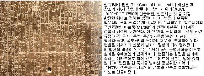 마지막으로 하나 지적하고 싶은 것은 옛 이스라엘인들도 조상숭배를 했다는 점입니다. 이들에게는 조상의 무덤에 구멍을 뚫어두고 음식을 바치는 관습이 있었는데 이는 수메르인들에게서도 그대로 나타나는 관습이었습니다. 죽은 조상에 대한 제사는 동이족의 관습과 완전히 일치하는 것은 두말할 필요가 없을 것입니다. 일반적으로 서양문명은 그리스·로마의 고전문명으로부터 나왔다고 합니다. 후대에 로마인들이 지중해 일대를 무력으로 정복하는데 그 가운데에는 그리스 문명권 즉 지중해 동부지역도 포함되어 있었습니다. 로마인들은 그리스문화의 우수성을 인정하고 그들을 스승으로 여겨 그로부터 열심히 배웠습니다. 로마인들은 건축이나 토목에는 능했지만 학문에는 썩 능하지 못했습니다. 모두 그리스인들로부터 배웠죠. 실제로 로마의 상류층은 아들을 그리스 학교로 보내 공부를 시키는 것이 일반화되어 있었습니다. 그래서 로마문명이 따로 있는 것이 아니라 그리스로마 문명이 된 것이죠. 다른 말로 하자면 그리스는 서양인들의 학교가 된 겁니다. 이들은 BCE 8~7세기 전후부터 폴리스라는 독특한 도시국가를 세워 그것을 생활의 틀로 삼았는데 무척 높은 수준의 문명과 국가를 이룩했습니다. 그리스인들의 학문과 예술, 도시건축 등은 오랫동안 유럽인들이 따라잡지 못했을 정도로 수준이 높았습니다. 중세기에는 그리스의 학문과 예술에 대해 제대로 평가할 역량도 없었습니다. 그러다 르네상스 시대와 와서야 그 진면목을 깨닫게 되었던 것입니다. 그런데 그리스문명이 갑자기 땅에서 솟아난 것일까요? 아닙니다. 그리스인들도 선진문명으로부터 많은 것을 배웠습니다. 그리스 주변에는 바빌로니아, 이집트, 페니키아 등이 있었는데 이들 문명들로부터 많은 것을 배웠습니다. 그런데 이들 문명은 모두 수메르문명의 계승자이자 후계자들입니다. [함무라비법전] 특히 바빌로니아문명이 그렇습니다. BCE 2000년 이후 수메르인들의 도시국가는 아카드인들을 비롯한 셈족들의 지배로 넘어가는데 이들은 수메르문명을 그대로 계승하였습니다. 문명에서 가장 중요한 것이 문자입니다. 수메르인들이 발명한 설형문자가 이들에 의해 계승되어 널리 퍼져나가 중동일대의 공통적 문자로 사용되었습니다. 문자와 더불어 그 문자로 기록된 학문도 전파되었던 것은 물론입니다. 그리스인들의 뛰어난 천문학도 수메르에서 왔습니다. 고대 그리스의 12궁도는 바로 수메르인들이 고안한 것이며 수학에서 각도와 시간을 재는데 사용되었던 60진법도 수메르에서 온 것입니다. 12궁도는 동양에도 있는데 아마 환국시대부터 존재했을 겁니다. 그리스인들이 바빌로니아문명을 열심히 배웠다는 것은 일부 메소포타미아 지역에서 발견된 점토판 가운데서 한 면에서는 설형문자가, 다른 한 면에는 그리스문자가 기록된 점토판이 있었다는 사실에서 입증됩니다. 이처럼 그리스문명이 수메르문명을 계승한 바빌로니아, 이집트, 페니키아 등의 선진문명에서 배웠다는 것은 그리스문명이 수메르와 연결되어 있음을 보여주는 것입니다. 그리스에서 볼 수 있듯이 선진문명으로부터 열심히 배우는 것은 열등함을 나타내는 것이 아니고 오히려 지혜로움을 나타내는 것입니다. 20세기 한국도 그렇게 해서 성공한 경우입니다. 우리는 우리 문화의 우수성을 제대로 평가하지 못하고 있습니다. 한글의 바탕이 가림토 문자이고 이는 이미 수천년 전부터 우리 민족이 사용해오던 글자입니다. 그리고 상투나 윷놀이, 댕기머리 등도 상고시대로부터 내려온 소중한 의미를 간직한 문화유산들입니다. 『환단고기』에는 이러한 내용들이 모두 자세히 기록되어 있습니다. 『환단고기』가 위서라는 편견에 사로잡혀 그 책을 제대로 읽어보지도 않으려 하는 것은 정말 어리석기 그지없는 일입니다. 지금 한류가 전세계를 휩쓸고 있는데 그것 또한 우연히 일어난 일은 아닐 것입니다. 수천년 이어온 문명의 종주국이기에 가능한 일이 아닐까요? 우리 모두는 한민족으로서의 자긍심을 가지고 우리 문화와 우리 역사를 새롭게 바라보고 배우고 전해야 할 것입니다. 성서학자들에 의하면 모세의 5경인 구약의 창세기.출애굽기.레위기.민수기.신명기에 쓰여진 제사음식.性행위.종족번식.사회규율 등의 율법은 그 제정 유래 및 각 법조(法條)의 형식과 내용에 이르기까지 거의 대부분이 함무라비법과 같다고 한다. 그리고 함무라비法의 기원은 바로 인류최초의 법전인 수메르법전이다.