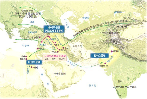 이스라엘의 시조인 아브라함은 이 메소포타미아의 갈대아 우르 지방에서 태어난 슈메르인의 후손으로서 성장 후 고향을 떠나 가나안 땅으로 이주하였다. 유대교를 창설한 이스라엘 민족의 후손인 모세는 자기 민족의 수호신인 여호아를 중심으로 자기 민족의 정신적 단합을 도모하였다. ◆ 뮐러(Muller), 유대인의 시조(始祖)인 아브라함이 우루 땅에서 함무라비 왕의 고향인 하란을 거쳐 가나안 땅으로 이주해 오면서 함무라비 법전을 가져 왔을 것이다.