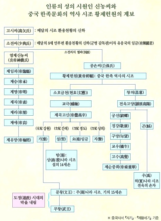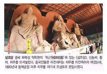 예를 들어 현재 탁록이라는 곳에 삼조당三祖堂이 있습니다. 여기에 한민족의 조상인 염제신농씨와 치우천황이 중국 역사의 시조로 일컬어지는 황제 헌원과 함께 모셔져 있습니다. 중국인들은 오래 전부터 우리 배달겨레의 조상인 태호복희씨와 염제신농씨를 자기네 조상으로 모셔왔는데 삼조당을 지으면서 마침내 치우천황까지 자기네 조상으로 모신 것입니다. 한술 더 떠서 중국은 치우천황 후반기의 주 활동무대였던 탁록을 ‘중국 5천년 문명사의 요람’이자 ‘중화민족의 주요 발상지 중의 하나’로 치켜 세웠습니다. 한민족의 조상을 삼조당에 모셔 그들의 조상으로 만들더니, 이제 한민족의 고토인 탁록까지 그들의 시원역사 무대로 만들었습니다. 중국이 자기들 조상이라 우기는 복희씨는 5천여년 전 배달시대에 인간의 생활문명을 크게 진작시켰던 문명의 창시자입니다. 또한 팔괘의 창시자로서 대한민국의 태극기는 바로 이를 바탕으로 만들어졌습니다. 이러한 복희씨를 모신 사당이 중국 내 도처에 있습니다. 그 가운데 최근에 크게 증축된 하남성 회양현의 복희묘가 가장 규모가 크고 유명하여 그곳에는 수많은 방문객이 늘 장사진을 치고 있습니다. 중국이 이곳에 복희 사당을 내세운 것은 복희씨의 이동 경로를 변조하여 그를 중국 본토에서 태어나 평생 그곳에서 살다 간 완벽한 중국인으로 만들기 위해서입니다. 왜 복희씨가 완벽한 중국인이 되어야 했는지, 그에 대한 답을 우리는 고풍스럽게 장식한 회양현 사당의 정면에 걸린 현판, ‘인문시조人文始祖’(인류문명의 첫 조상)에서 찾을 수 있습니다. 복희씨를 온 인류의 큰 조상으로 내세워, 복희씨의 후손인 현 중국을 전세계 사람들의 어버이 나라로 만들려는 것입니다. 중국 농업·의약·경제의 조신祖神이며, 중국문화의 원천으로 알려져 있는 신농씨도 배달 동이족입니다. 약 5200년전 8세 배달국 안부련환웅 때의 인물인 신농씨는 배달 동이족의 강씨 성의 시조입니다. 그는 고시씨의 방계 자손이며, 웅씨족 출신인 소전少典의 아들입니다. 신농씨의 아버지 소전少典은 안부련환웅의 신하이자, 유웅국有熊國의 군주였습니다. 『태백일사太白逸史』 「삼한관경본기」에 “웅씨족에서 갈려나간 후손 중에 소전이 있었다. 안부련환웅 말기에 소전이 명을 받고 강수에서 군병을 감독했다.”(熊氏之所分曰少典, 安夫連桓雄之末, 少典以命監兵于姜水)라는 기록이 있습니다. 중국 정부는 동이족의 조상인 복희씨, 신농씨, 치우천황을 자기네 조상으로 모시는 것에 대해 ‘한족과 55개 소수 민족으로 구성된 다민족 국가인 중국에서 소수 민족의 조상들은 모두 중국의 조상이다’라는 억지 논리로 정당화시키고 있습니다. 이들 배달국의 성인 제왕들 외에 우리가 동이족인 줄 알지 못했던 역대 인물들이 많이 있습니다. 한족의 시조로 알려진 황제 헌원을 비롯하여 오제로 손꼽히는 요임금, 순임금도 본래의 혈통이 동이족입니다.