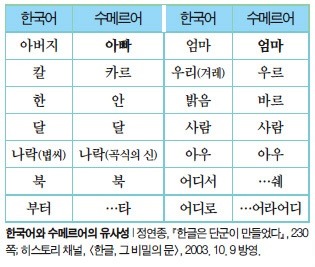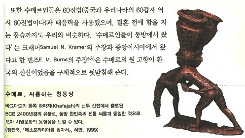 ◆ 中田薰(일본 : 前동경大교수), 모세 5경의 모법(母法)은 함무라비法이고 함무라비法의 母法은 슈메르법이다. 기독교의 역사는 서구문명의 발상지인 고대 메소포타미아의 문명으로부터 비롯되었으며, 메소포타미아 문명은 수메르인들에 의하여 성립된 것이다. 유프라테스강.티그리스강 유역에 고대 메소포타미아 문명을 개척한 족속은 동방(東方)으로 부터 이주해온 슈메르족이었다. ◆ 삼성기(三聖記), 고기(古記)에 이르되 환국(桓國)에는 분국(分國)이 12나라였다. 그 넓이가 남북이 5만리요 동서가 2만리이니, 그 12국 가운데 우르(虞婁 : Ur)國과 슈메르(須密爾 : Sumer)國이 있다. ◆ 크렘머와 다글라스氏(美), 슈메르인은 동방(東方)으로부터 왔다. ◆ 대영백과사전(大英百科辭典), 슈메르語와 한국어는 동일한 [교착어]로서 그 어근(語根)을 같이 한다. ◆ 上野景福(日本), 슈메르인들이 사용한 설형문자는 약 5500년전 태호복희씨가 사용한 8괘 부호등과 비슷하다. ◆ C.H 고든박사(英), 슈메르인들이 중근동(中近東)에 들어오기 前에 고대문자적(古代文字的)기호를 가지고 왔다. | |||||||||||||||||||||||||||||||||||||