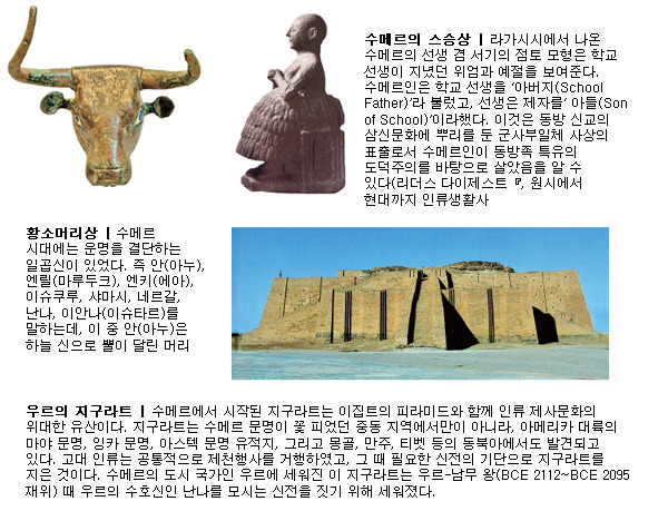 또 수메르인들은 우주를 ‘안키’라고 부르고 우주를 둥근 하늘과 평평한 땅으로 이뤄져 있다고 생각하였는데 이는 동양의 천원지방(天圓地方) 사상과 다를 바 없는 것입니다. 또 수메르인들은 왕권이 하늘에서 내려왔다는 천명사상을 가지고 있었는데 이는 동양의 천명사상과 동일한 것입니다. 그 외에도 순장의 관습이 있었다든지 상투를 틀었다든지 여인들이 머리에 물건을 이고 다녔다든지 고대 한국의 관습과 유사한 관습을 가지고 있었습니다. 빼놓을 수 없는 것은, 동이족 문명은 수메르는 물론 히브리, 나아가 기독교문화와도 연결돼 있습니다.