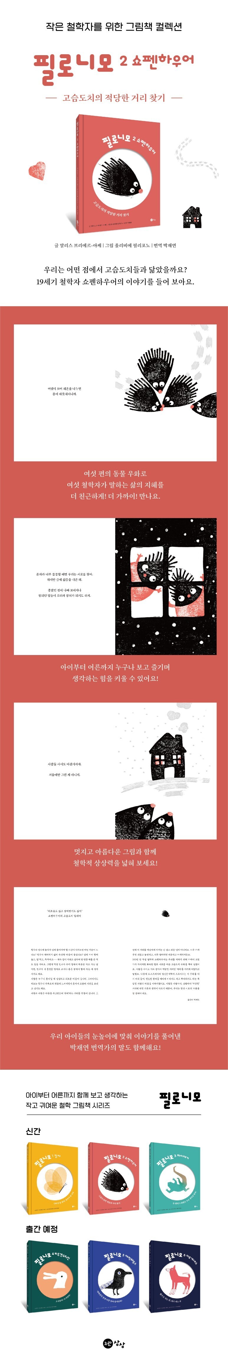 《필로니모 2 쇼펜하우어 : 고슴도치의 적당한 거리 찾기》에서는 19세기 독일 철학자 쇼펜하우어의 고슴도치 이야기를 다뤘어요. 겨울을 나기 위해 체온을 나누던 고슴도치들이 서로의 가시에 찔려 상처를 입고 물러났다가, 다시 추위에 떨며 모여들고, 또다시 흩어지기를 반복해요. 쇼펜하우어는 이 모습을 보며 고슴도치뿐만 아니라 사람과 사람 사이에도 서로를 해치지 않는 거리가 필요하다고 생각했어요. 과연 쇼펜하우어가 말하는 ‘적당한’ 거리는 무엇일까요?