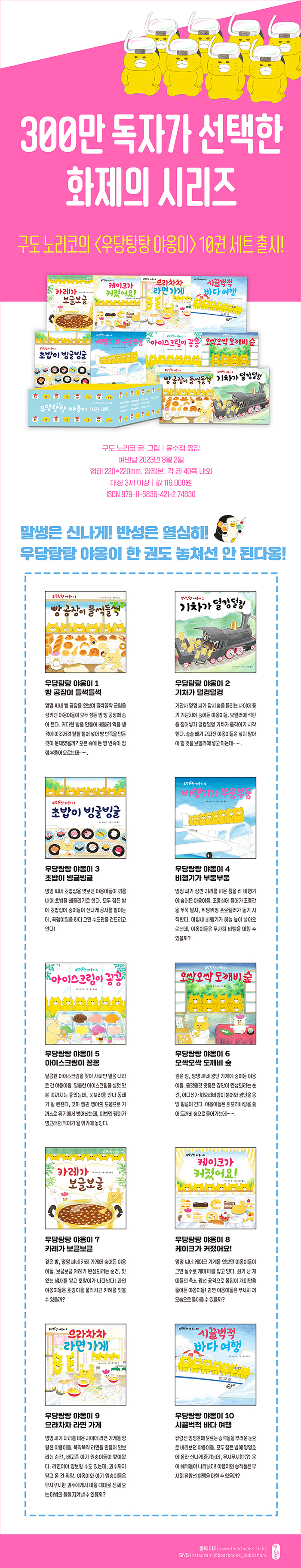 전 세계에서 300만 부가 넘게 팔린 화제의 시리즈 〈우당탕탕 야옹이〉 10권 세트가 출시되었다. 궁금한 건 절대 못 참고, 먹고 싶은 건 꼭 먹어야 하고, 하고 싶은 일은 꼭 해야 하는 여덟 마리 야옹이는 우리 아이들을 쏙 빼닮았다. 멍멍 씨에게 들키면 혼날 줄 알면서도 마음껏 저지를 때 느끼는 짜릿한 행복감에 번번이 사고를 치고 만다. 그 모습이 ‘마음껏 저질러 보고 싶은’ 어린이의 욕망을 한껏 충족시켜 준다. 사실 어린이에게 필요한 것도 다르지 않을 것이다. 마음껏 저질러 볼 기회와 자신이 저지른 일을 스스로 수습할 기회, 그것만 주어진다면 어느 순간에 눈부시게 성장한 모습을 보여 주지 않을까? 여덟 마리 야옹이와 함께 어린이 내면의 꾸러기들을 마음껏 해방시켜 보자!