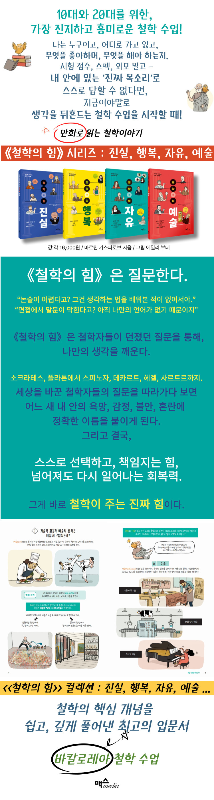 철학은 먼 학문이 아닙니다. ‘나는 지금 진실하게 살고 있는가?’ ‘진짜 행복이란 무엇인가?’ ‘나는 자유로운가?’ ‘왜 어떤 것에 감동하는가?’처럼 삶 속에서 끊임없이 마주하는 질문들에 대한 사유입니다. 《철학의 힘》 시리즈는 이러한 질문을 철학자들의 사유와 함께 만화라는 형식으로 쉽고 깊이 있게 풀어냅니다.