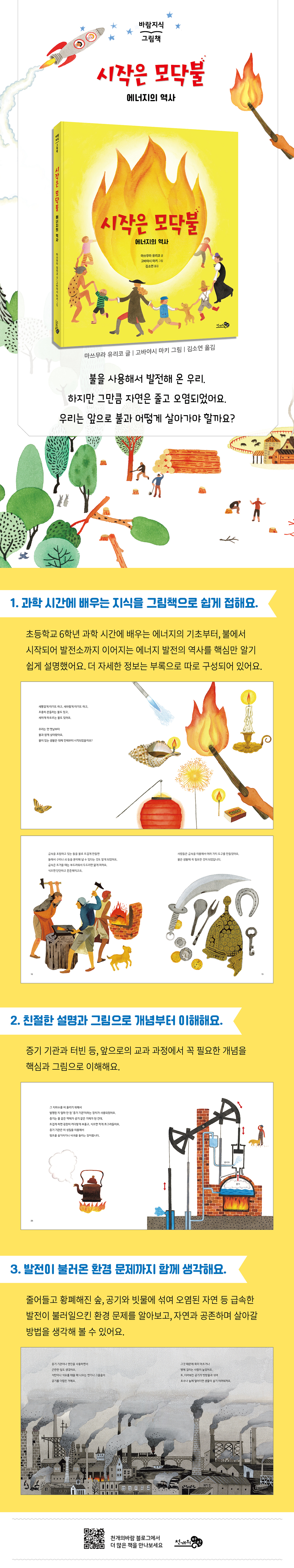 불을 이용해 발전해 온 인류의 역사, 그리고 불을 바탕으로 이어져 온 에너지의 역사를 쉽고 간결하게 표현했습니다. 에너지의 변환부터 신재생 에너지까지, 더 자세한 이야기는 부록처럼 본문 뒤에 따로 구성하여 더 깊은 지식을 찾아보기도 용이하지요. 막 교과 과정을 시작하는 고학년 어린이가 전체적인 흐름을 훑어보는 마중물 책으로도 좋고, 과학과 발전에 관심이 있는 저학년 어린이가 읽고 이해하기에도 좋은 지식 그림책입니다.