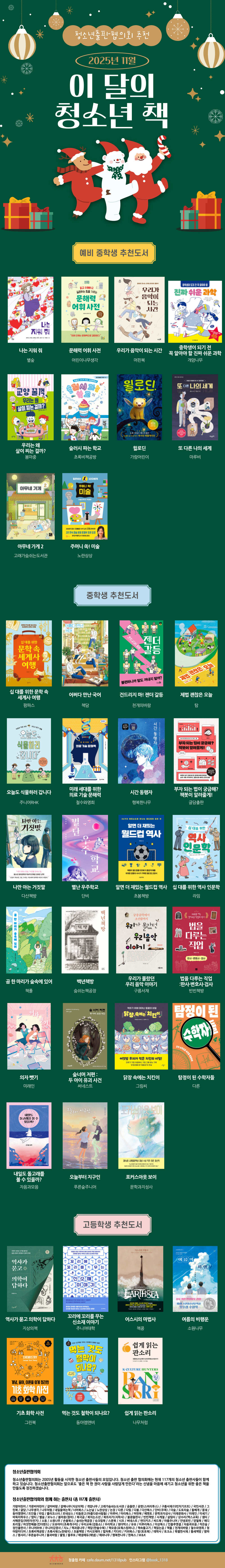 2025년 11월 - 청출협 이 달의 청소년 책 (엑셀 파일 첨부) 작성자김민경/팜파스|작성시간25.11.20|조회수124 목록 댓글 0 글자크기 작게가 글자크기 크게가 ▼25년 11월 청출협 이 달의 청소년 책 목록▼25년11월_청출협이달의청소년책.xlsx17.88KB 첨부파일첨부된 파일이 2개 있습니다. jpg 파일 25년11월이달의청소년책.jpg 다운로드 xlsx 파일 25년11월_청출협이달의청소년책.xlsx 다운로드 다음검색 현재 게시글 추가 기능 열기 북마크 공유하기 신고 센터로 신고 댓글 댓글 0 댓글쓰기 답글쓰기 댓글 리스트