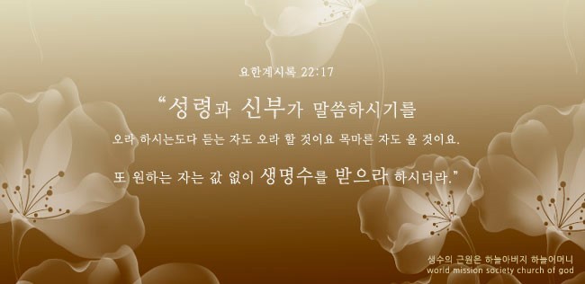 하나님께서는 영생을 주기 위해서 이 땅에 오셨습니다(사 25장 6절). 영생을 받지 못한 사람들은 사망이 없는 천국에 갈 수 없기에 우리를 영생체로 변모시켜 주시고 천국에 데려가시기 위해서 이 땅에 성령과 신부로서 오셨다고 하셨습니다. 우리에게는 영생 주시고 천국 길 인도하시는 성령과 신부가 필요합니다.