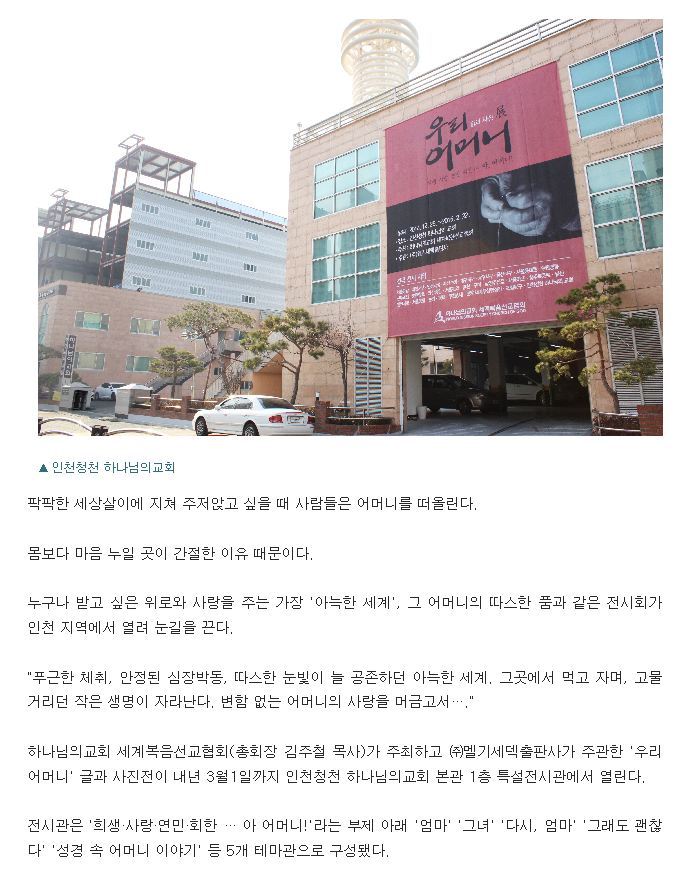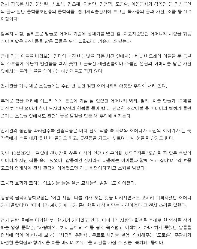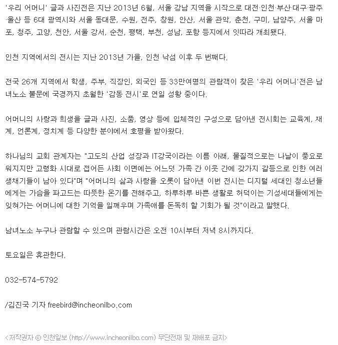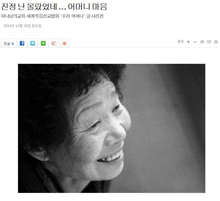 작성자사랑가득 작성시간 14.12.30 자녀향한 어머니의 사랑과 은혜를 느낄수 있는 우리어머니 글과 사진전!!