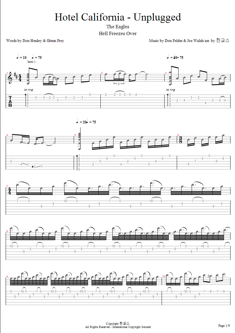 인터넷상에 떠도는 이글스 언플러그드 호텔 캘리포니아 악보뿐...