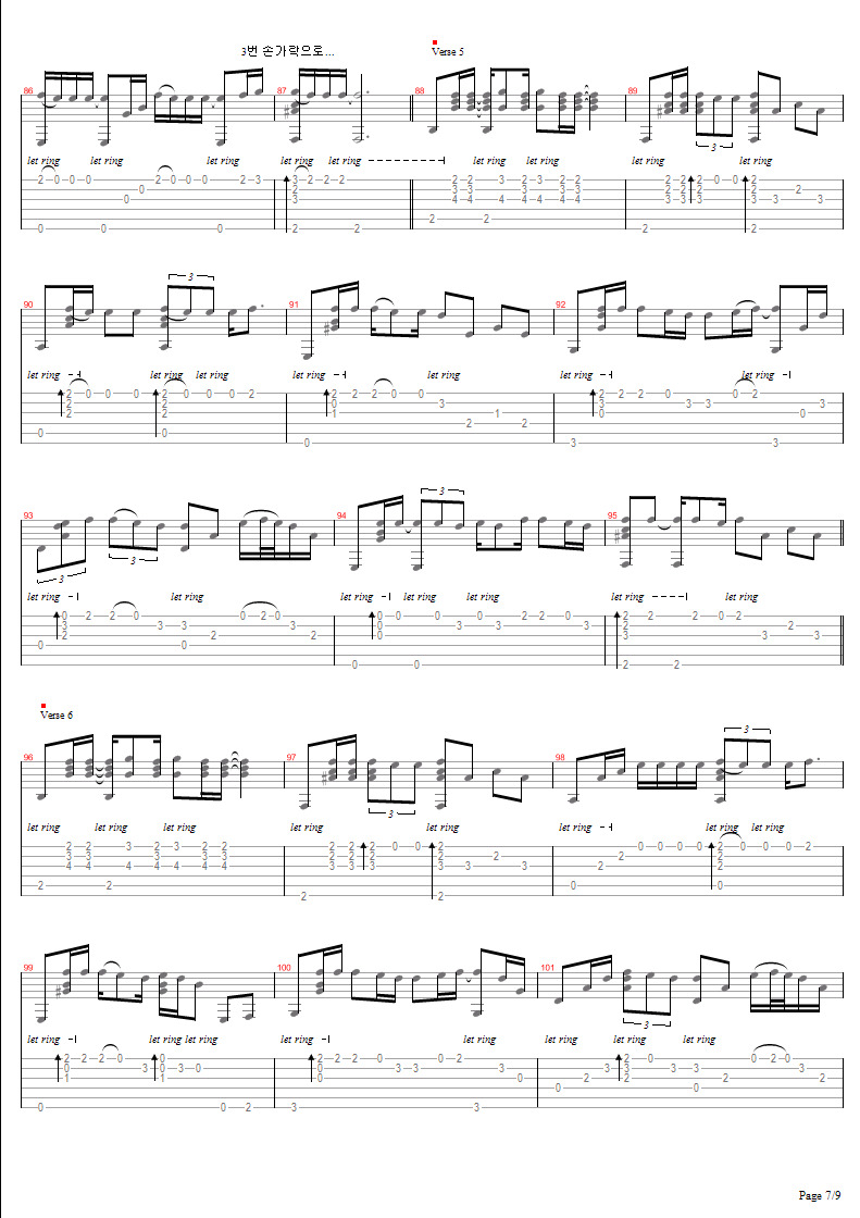 6번쨰 마디 7포지션 D코드로 옮겨갈 때 박자조심...
