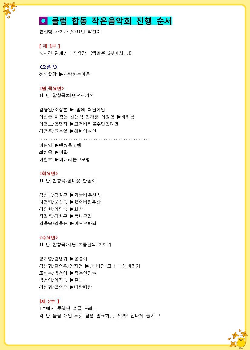 클럽 합동 작은 음악회 진행순서 작성자클럽회장|작성시간19.08.30|조회수677 목록 댓글 1 글자크기 작게가 글자크기 크게가 합동 음악회 진행 순서.hwp※위의 프로그램 명단에 없는 개인회원님은 제2부에서 특별 우선권 으로 노래합니다 ♬ 항상 음악과 즐거움이 있는곳 ! ♬ 광 주 통 기 타 클 럽 첨부파일첨부된 파일이 2개 있습니다. jpg 파일 image001.jpg 다운로드 hwp 파일 합동 음악회 진행 순서.hwp 다운로드 다음검색 현재 게시글 추가 기능 열기 북마크 공유하기 신고 센터로 신고 댓글 댓글 1 댓글쓰기 답글쓰기 댓글 리스트 작성자클럽회장 작성자 본인 여부 작성자 | 작성시간 19.08.30 1부에서 1시간 40분 정도 소요됩니다2부에서는 끝날때까지 개인 자유 발표회가 시작됩니다 댓글 전체보기